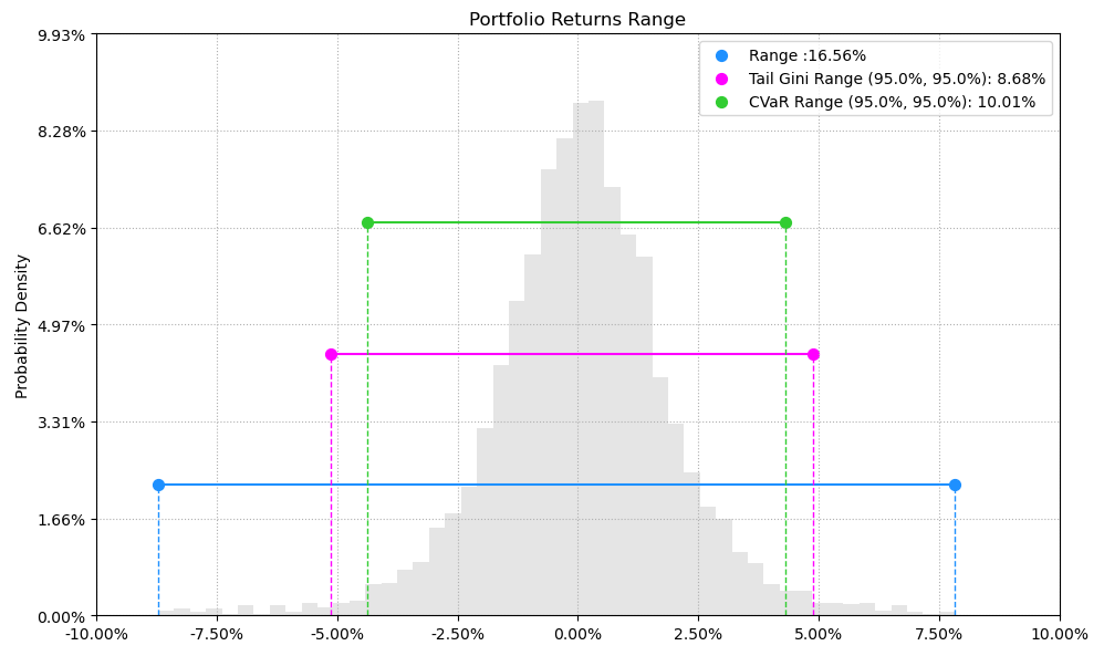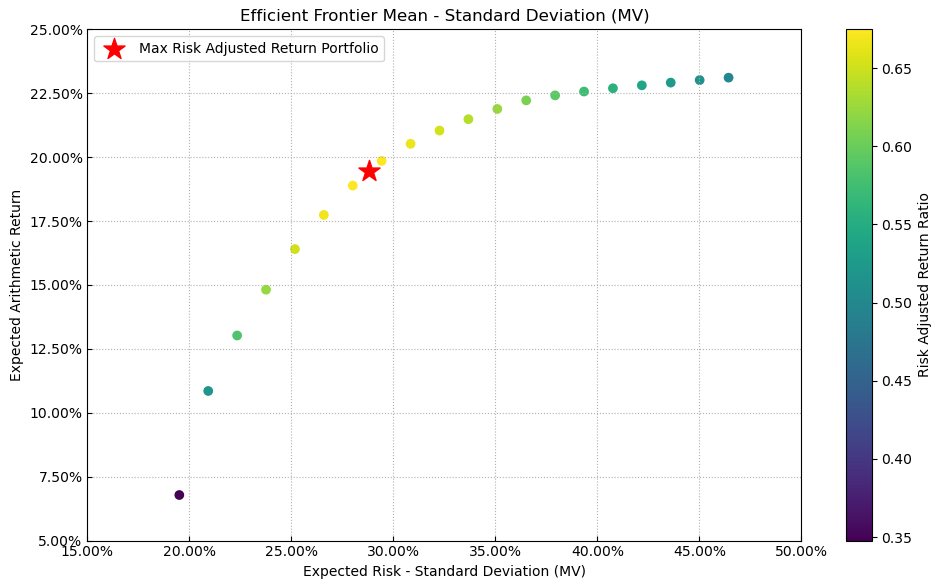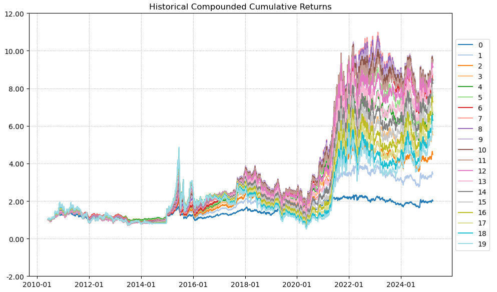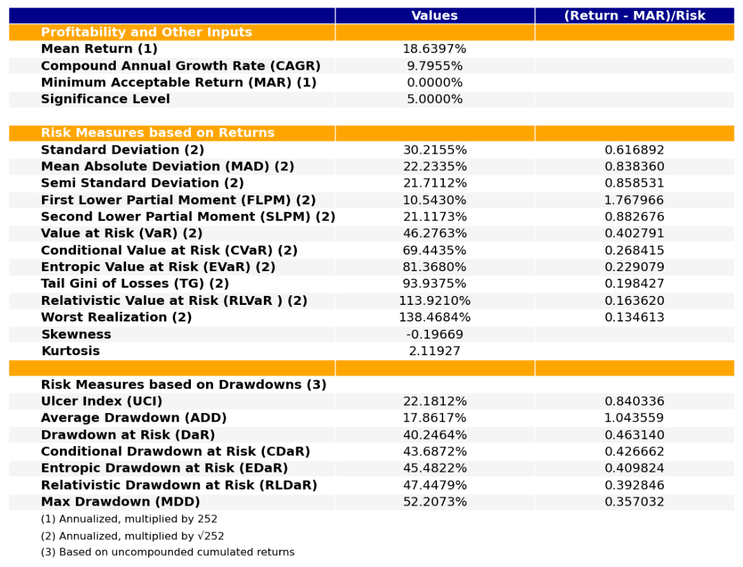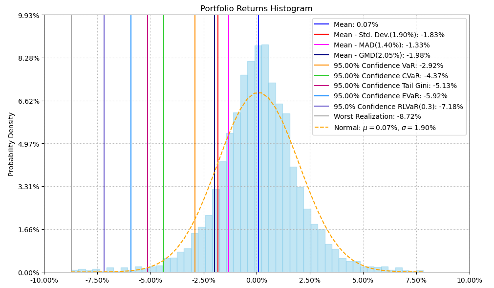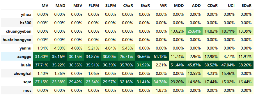 最后看下整个投资组合的情况,日度均值回报在0.07%,比上次测的工业机械行业低30%,而且10.01%的CVaR波动还更高。(注:均值回报看Mean那一栏,越高越好;CVaR波动看CVaR那一栏,越低越好)