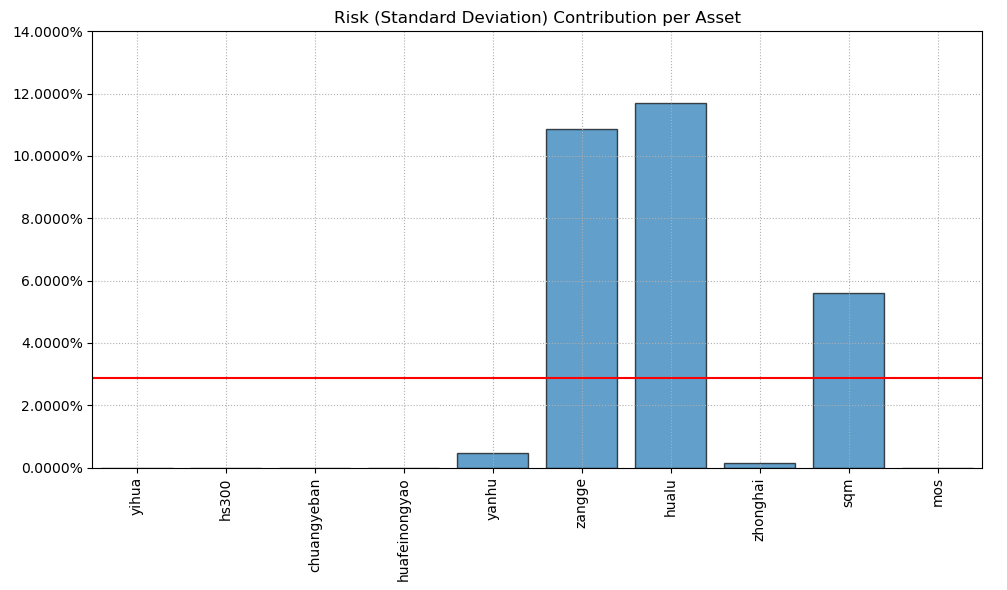 按最高夏普比率配置的话,系统给的权重为零,最大权重给了华鲁恒升占比37.7%。(注:占比越高越好)