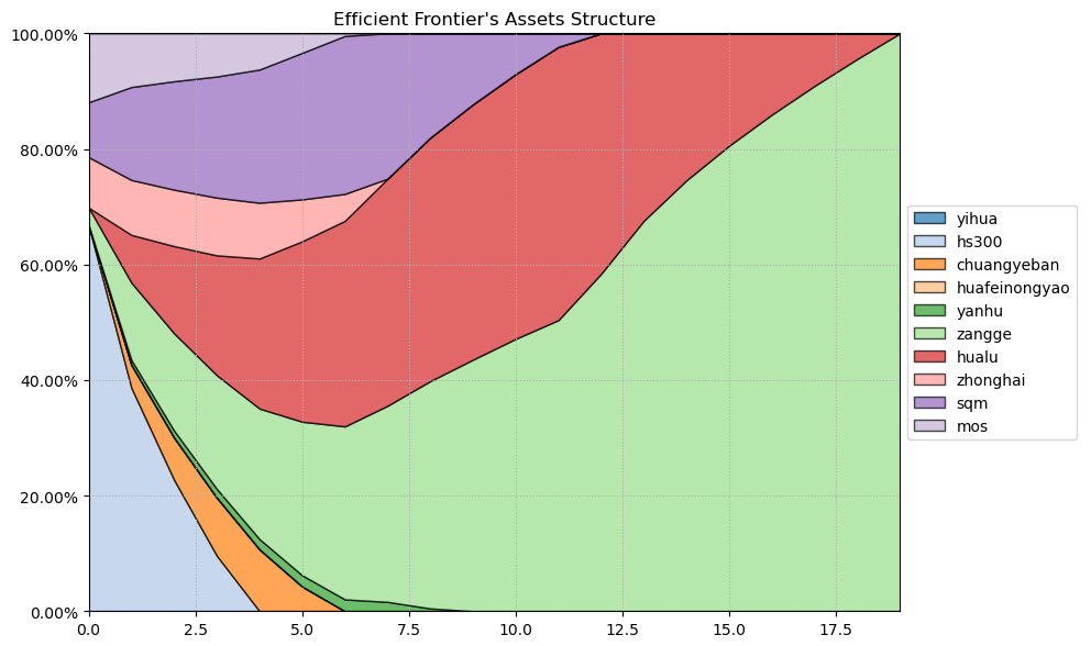 如果换成其他约束,系统给的配置比例也大同小异,基本是在华鲁恒升和美股的智利矿业化工之间做取舍了。(注:占比越高越好)