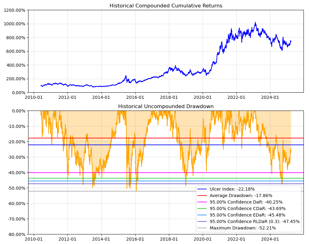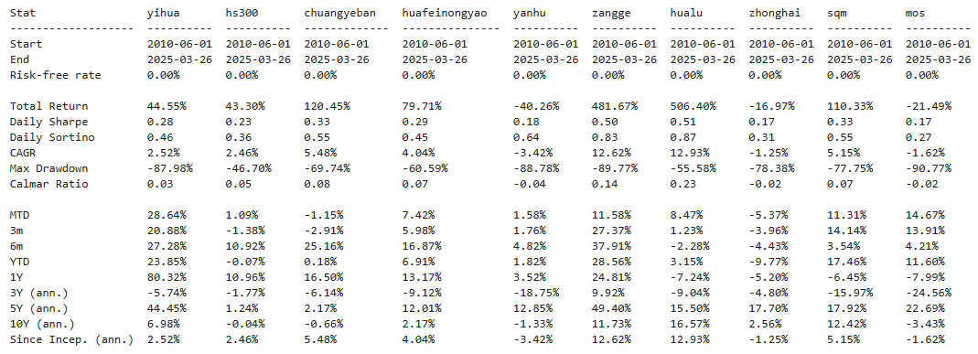 区间累计回报近10倍,最大回撤52.21%,投资组合的整体表现远好于湖北宜化个股。整个化肥农药行业盈利能力还行,波动偏大,夏普比率0.67令人失望。(注:累计回报看Cumulative Returns那一栏,越高越好;最大回撤看Maximum Drawdown那一栏,越低越好)