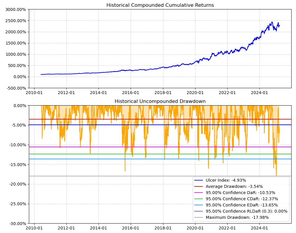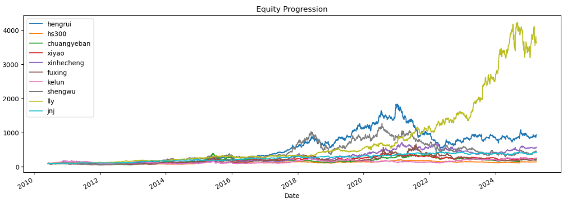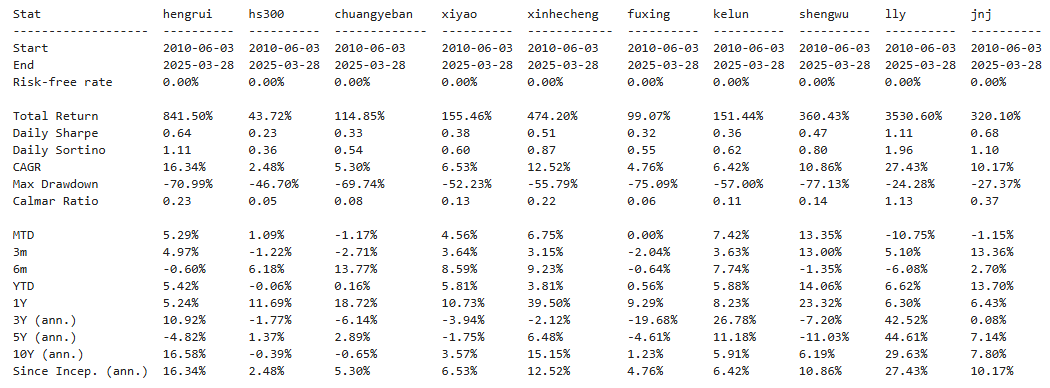 区间累计回报近25倍,最大回撤17.98%,投资组合的整体表现远好于恒瑞医药个股。整个西药行业盈利能力优异,波动还低,夏普比率1.33惊艳世人。(注:累计回报看Cumulative Returns那一栏,越高越好;最大回撤看Maximum Drawdown那一栏,越低越好)