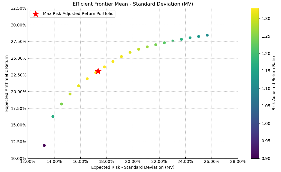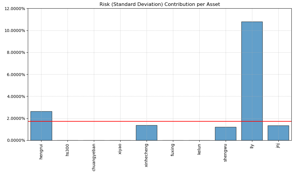 按最高夏普比率配置的话,系统给的权重为16.5%,最大权重给了美股的礼来占比50.4%。(注:占比越高越好)