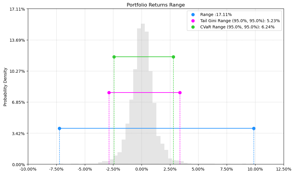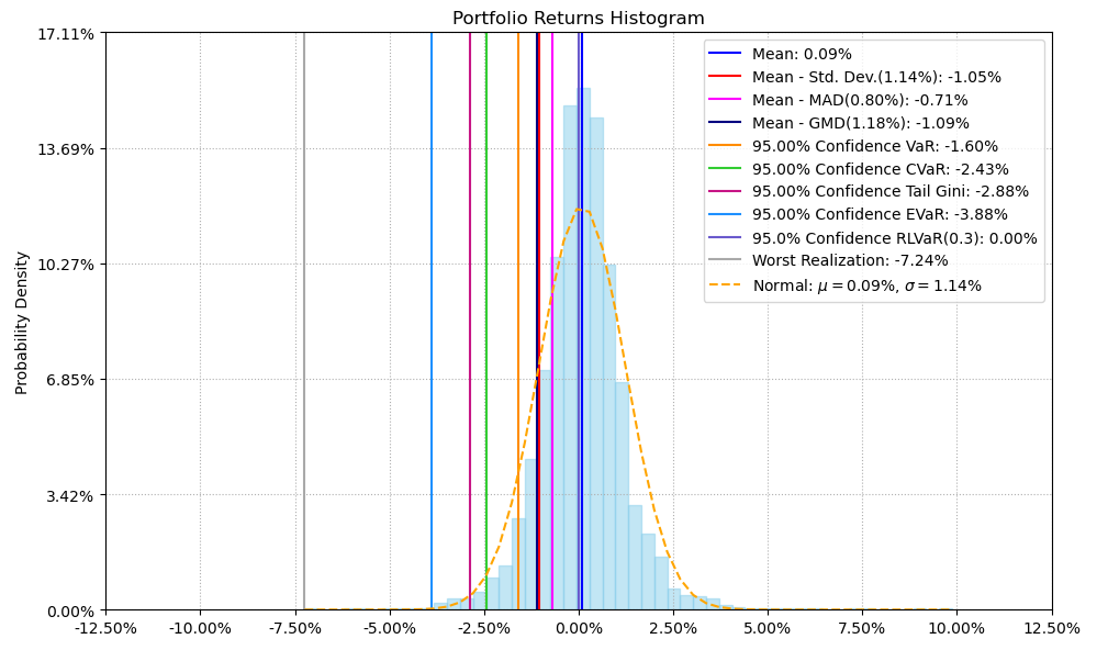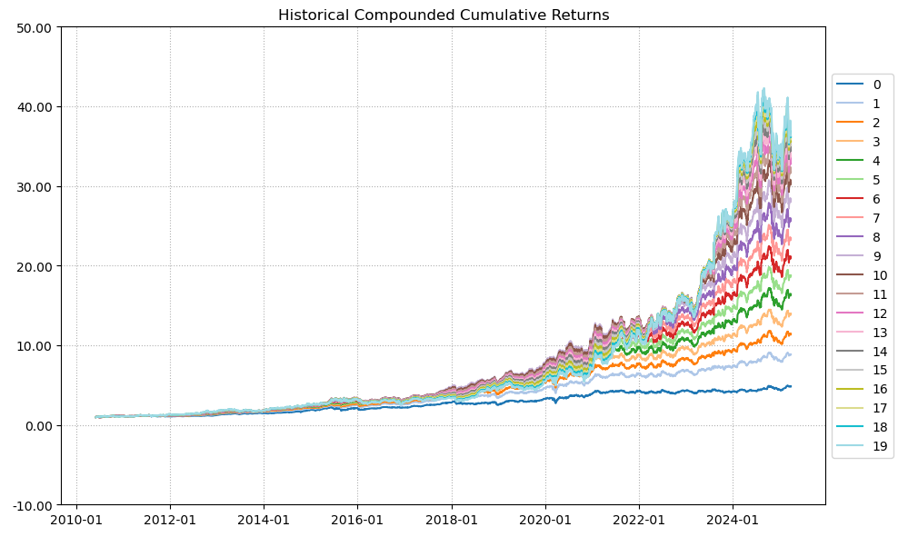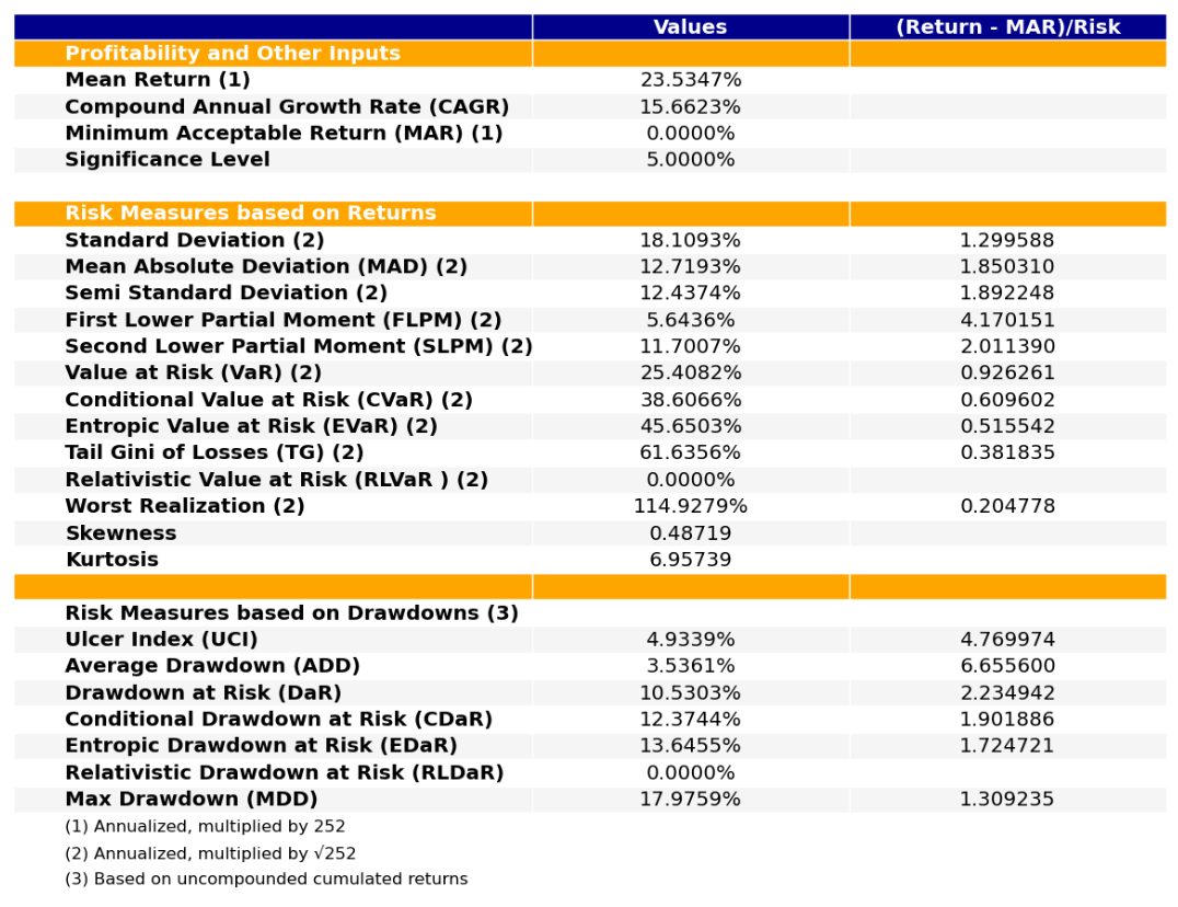 最后看下整个投资组合的情况,日度均值回报在0.09%,比上次测的商品化工行业高30%,而且6.24%的CVaR波动还更低。(注:均值回报看Mean那一栏,越高越好;CVaR波动看CVaR那一栏,越低越好)