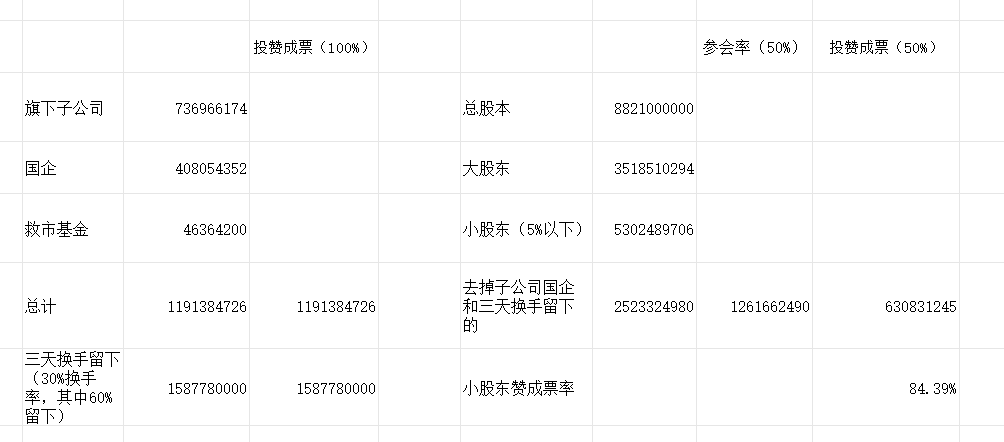 三天买入的有26亿股,剩下17亿,小散也就10亿,有个三五亿不投票的或大户投同意的,赞成超过70%没问题,只要这三天买入的不出叛徒就行。。。
