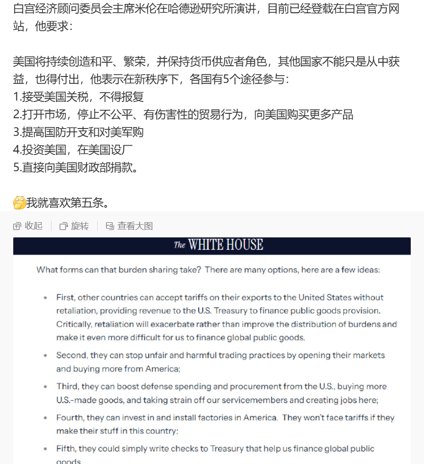 3.美元与美债,快40万亿美债怎么化债?只有美元贬值还债最划算,美元贬其他货币升值不符合美元利益,利用加关税逼迫其他国兑美元汇率降低,拉上其他货币一起贬值,不让在美吃高息的资本快速流出美国