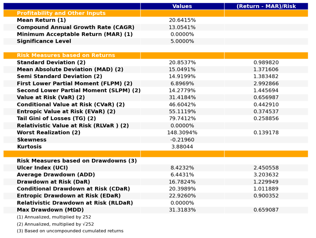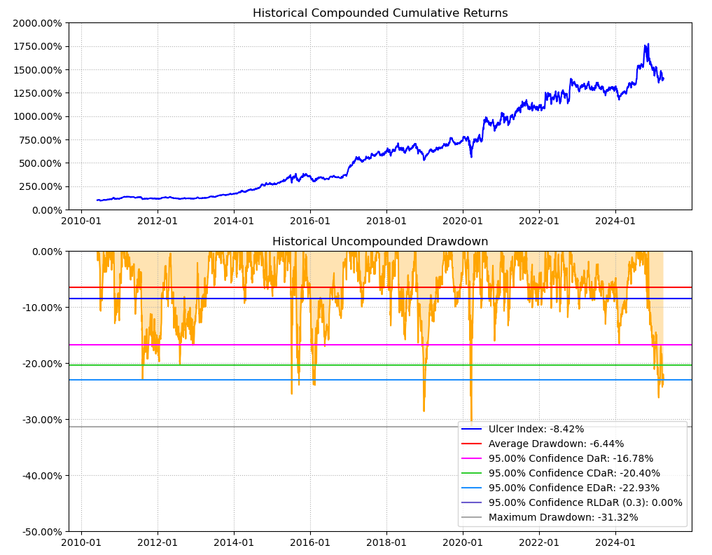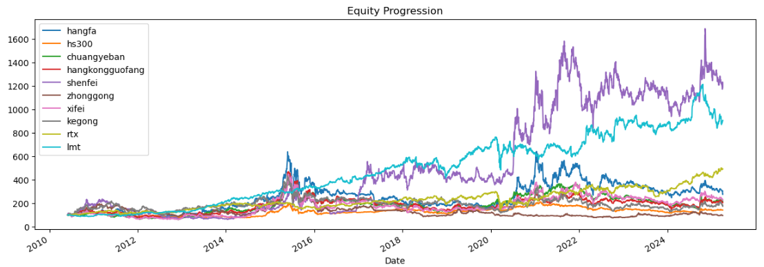 区间累计回报近18倍,最大回撤31.32%,投资组合的整体表现要好于航发动力个股。整个航空国防行业盈利能力不俗,波动也不大,夏普比率1.01还算可以。(注:累计回报看Cumulative Returns那一栏,越高越好;最大回撤看Maximum Drawdown那一栏,越低越好)