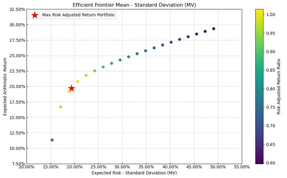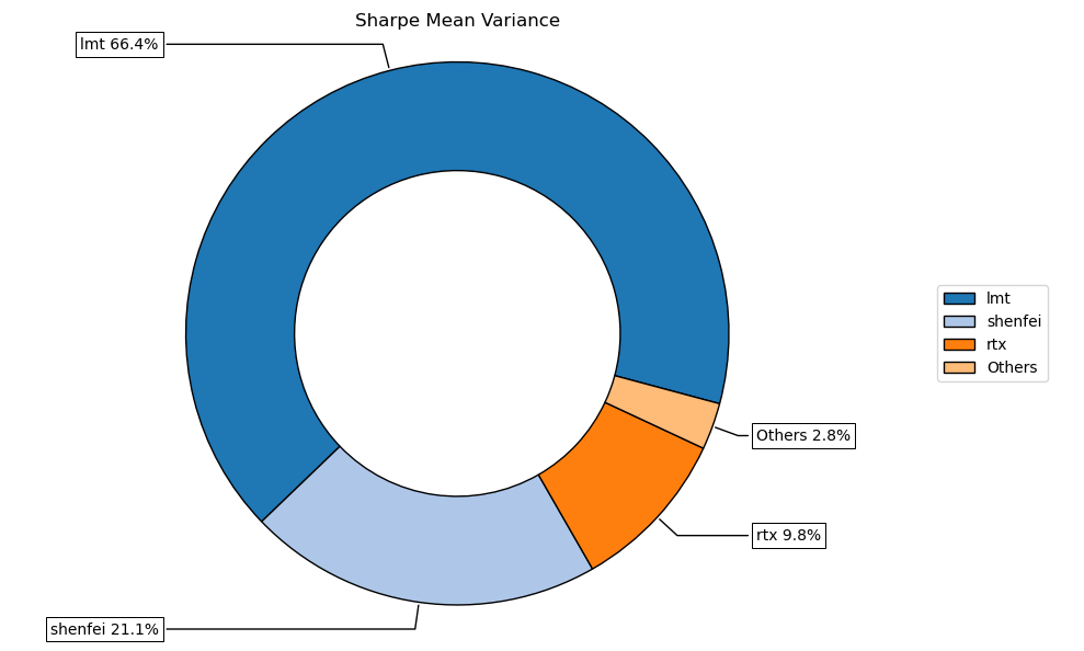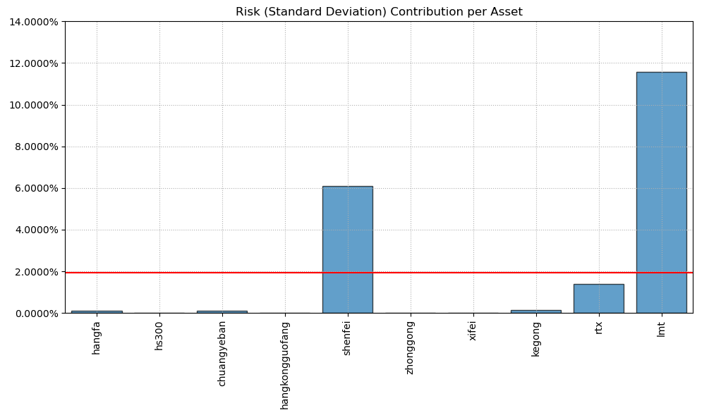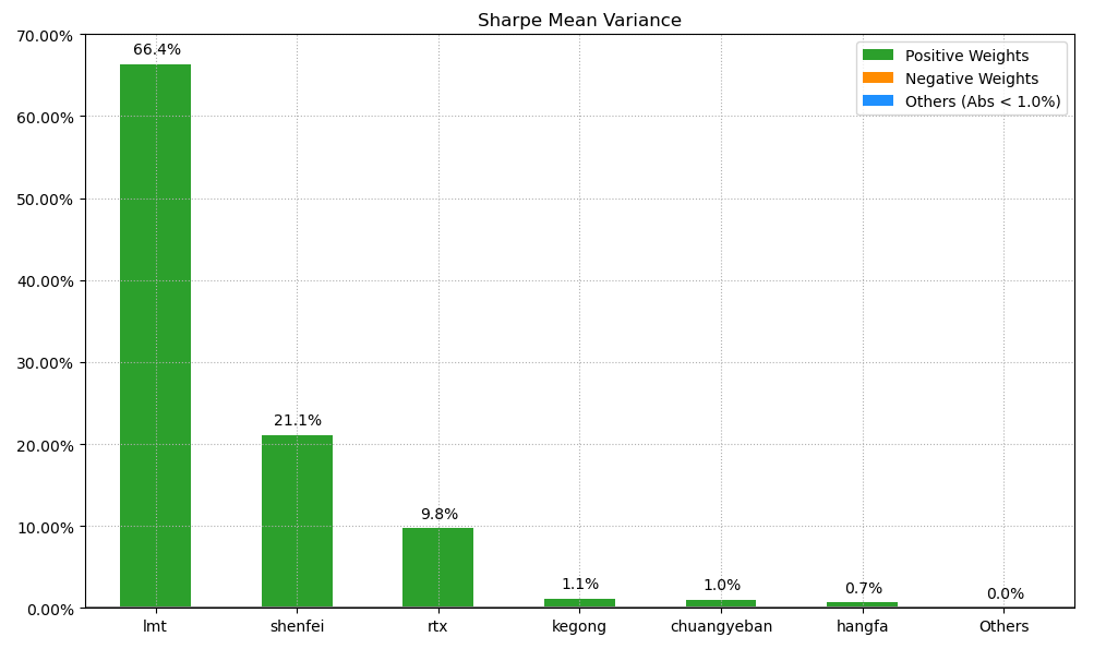 按最高夏普比率配置的话,系统给的权重趋近于0,最大权重给了美股的洛克希德马丁占比66.4%。(注:占比越高越好)