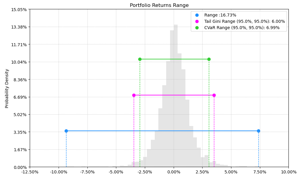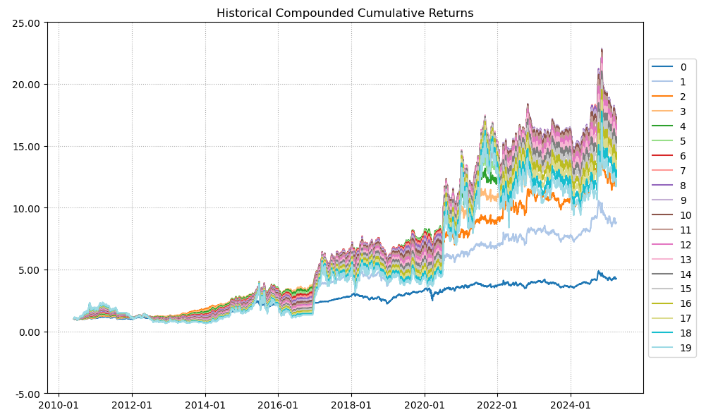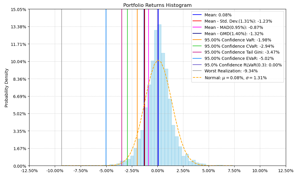 最后看下整个投资组合的情况,日度均值回报在0.08%,比上次测的光伏设备行业低40%,不过相应地6.99%的CVaR波动也小大很多。(注:均值回报看Mean那一栏,越高越好;CVaR波动看CVaR那一栏,越低越好)