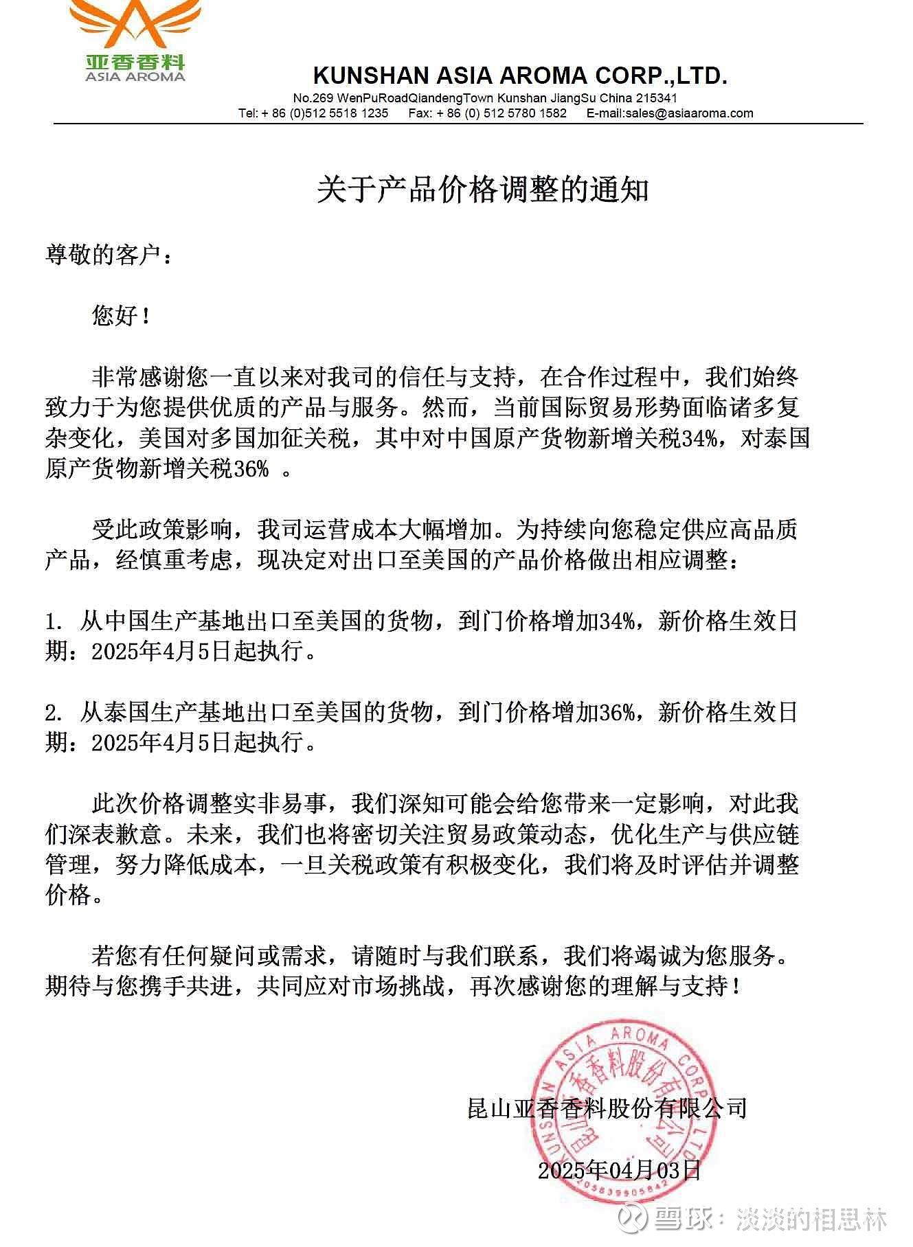 这个公司脑子进水了吧,美帝加了36%的关税,他给自己的产品加了36%的价,销售到美帝的产品价格大幅增加,这不就是特总的意愿吗,特总乐疯了。比亚迪3天前宣布降价,这样美帝加税,比亚迪降价,销售到美帝的价格被抵消了,特总气得吐血。具有产品定价权的企业根本不怕你加什么说。首先香料化工行业属于特小众行业。有一点的技术垄断性和产品的独占性。就是靠技术门槛把外来者阻挡在外。外来者没有个10年20年很难在这个小众市场立足。