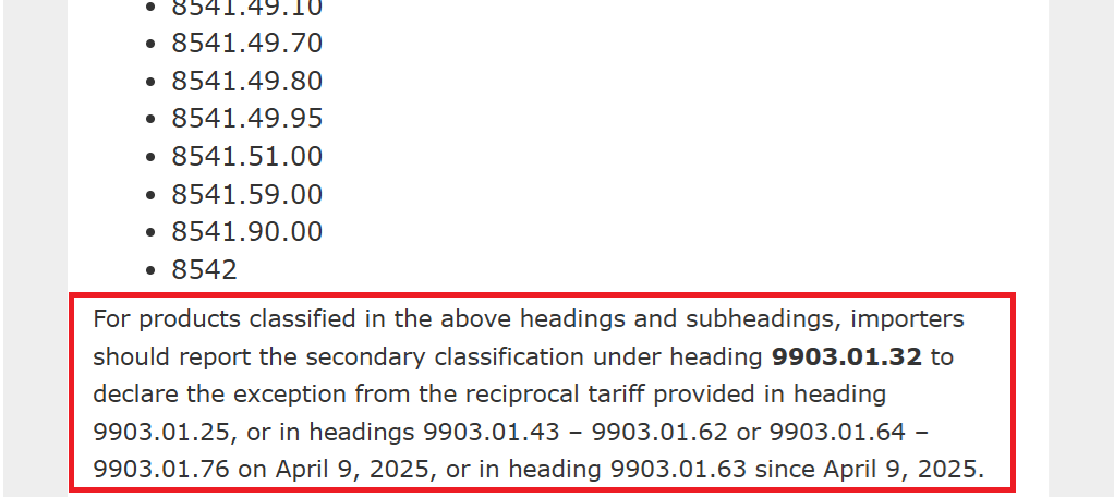 所以,我朝产品到底在不在豁免清单里?因为我看到有的楼说是原产中国排除在外。。。从通知的原文看,没有明确,PRC的相关项目产品能豁免。要想得到豁免,需要进口商在9903.01.32税目项下申报二级分类,以声明免除9903.01.25税目规定的互惠关税(即 豁免惩罚性关税)