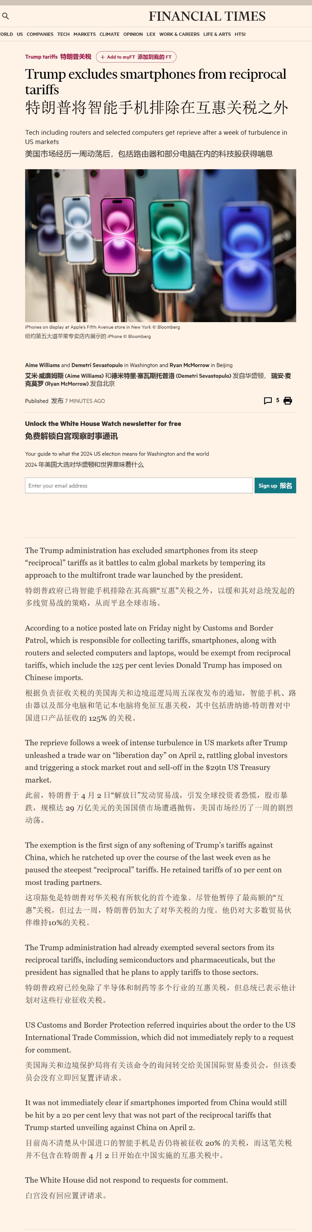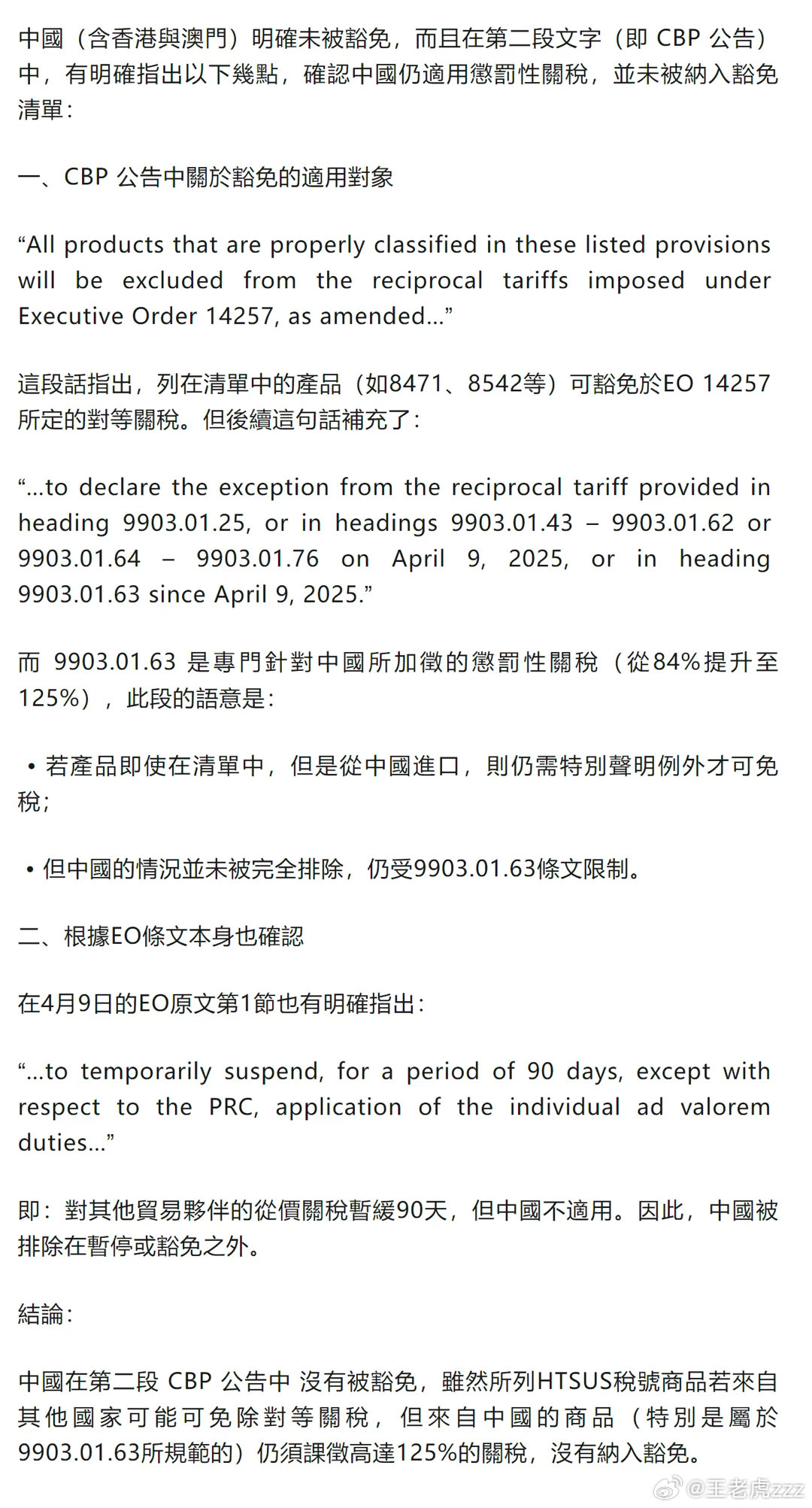 还需要再求证一下你这个图的第二点特别搞笑,所有国家(除了中国)特定对等关税的暂免90天(不免10%的基准对等关税),和豁免产品清单完全是两个逻辑。