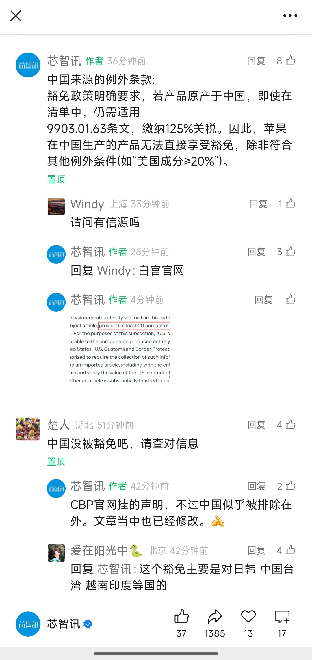 未单列“中国例外”:豁免政策未特别排除中国,意味着中国产的相关商品若满足条件(如美国成分占比达标),同样可免除125%的“对等关税”8。