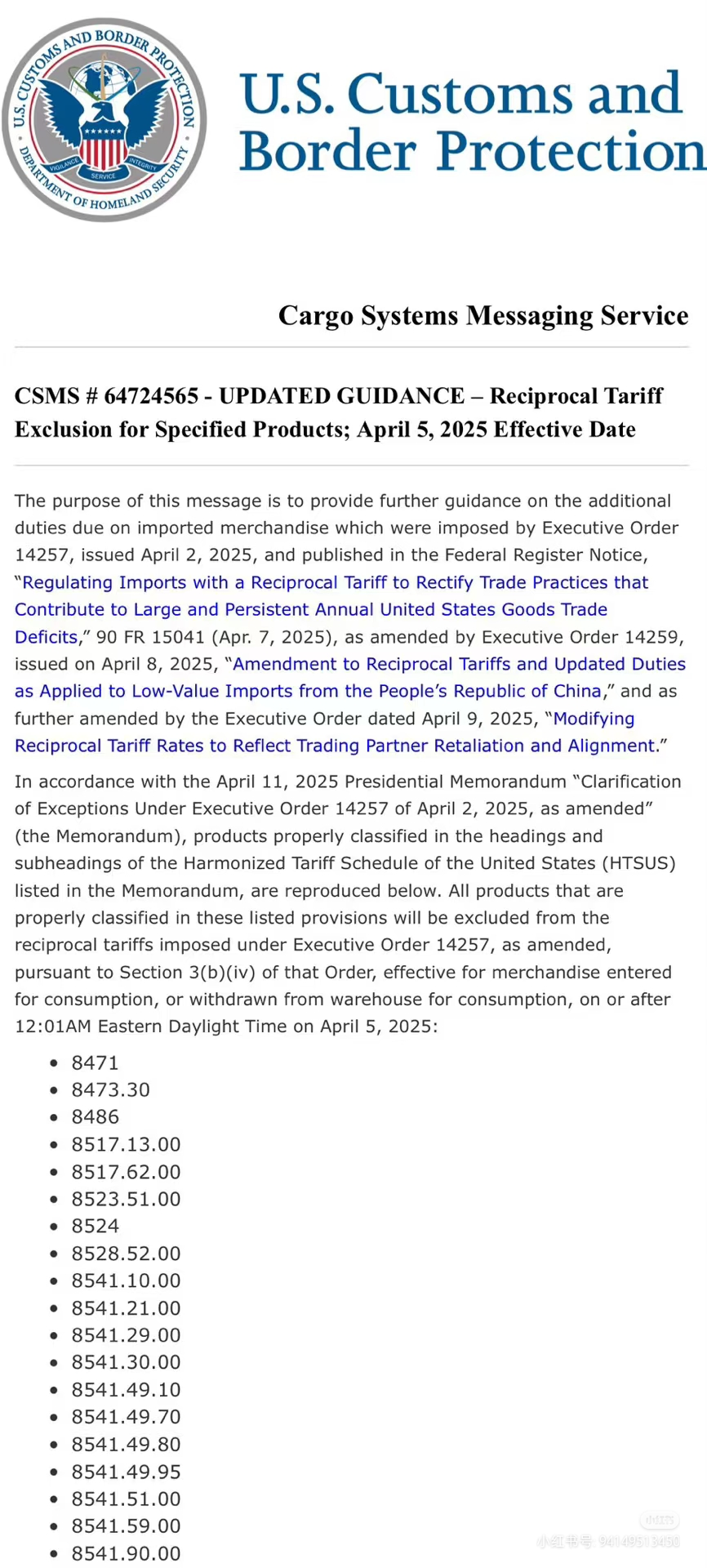 适用产品:豁免清单涵盖智能手机、电脑、服务器、半导体器件、集成电路、显示器等20余类电子产品,具体税则编码包括HTSUS8471(自动数据处理设备)、HTSUS8517.13.00(智能手机)、HTSUS8542(集成电路)等157。