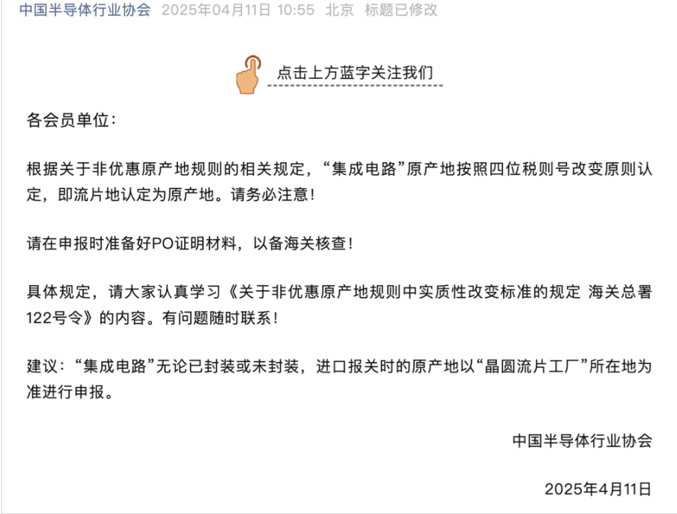 中国半导体行业协会4月11日发布关于半导体产品“原产地”认定规则的紧急通知,“集成电路”原产地按照四位税则号改变原则认定,即流片地认定为原产地。这意味着,部分在美国流片生产的半导体产品可能因关税影响而涨价。一位芯片渠道商对记者表示,“以前大家对原产地的认定可能就是看产品标签,其实界定的没有那么严格,另外因为大多数封测产能都在东南亚区域,行业里面原本认为对于关税带来的影响不是很大,但是如果认定是流片环节,那意味通过美国晶圆厂制造的芯片将会加收高额关税,比如TI德州仪器、英特尔等,短期内对相关公司的模拟芯片需求将会转移至国内。