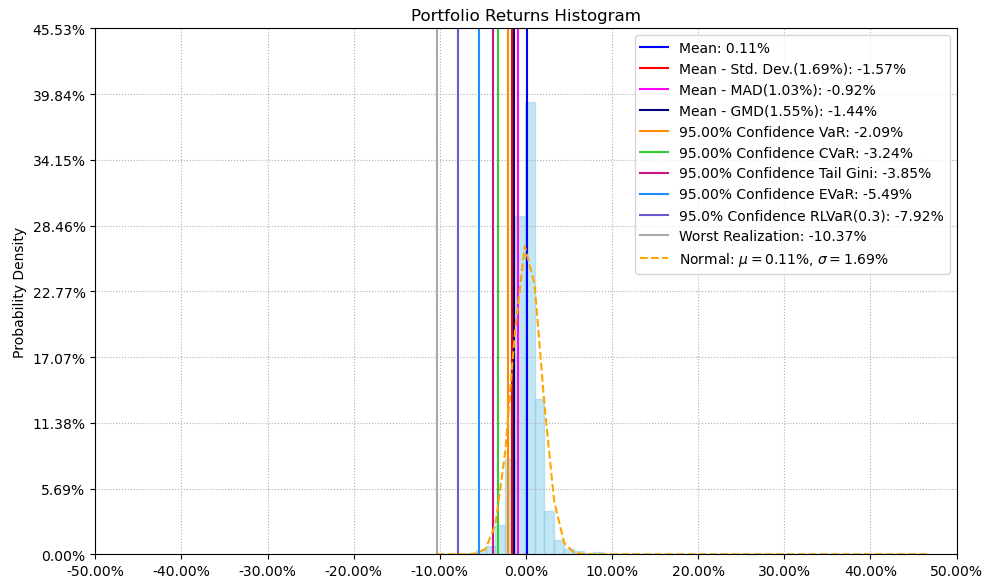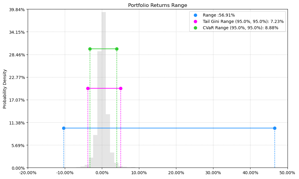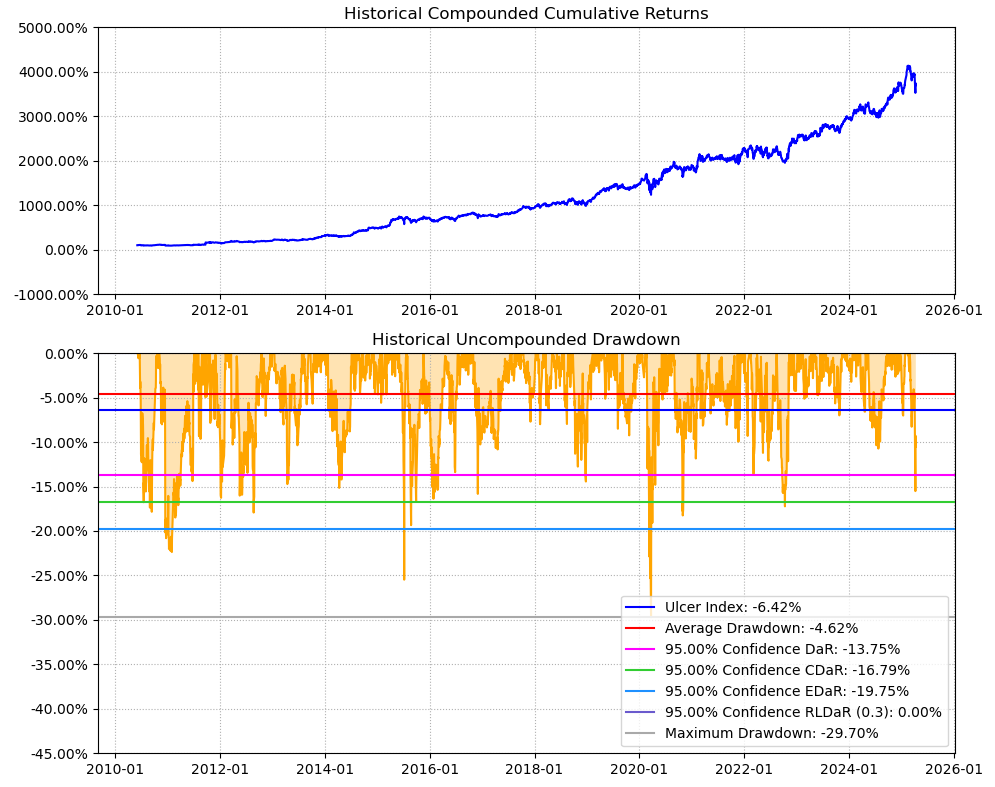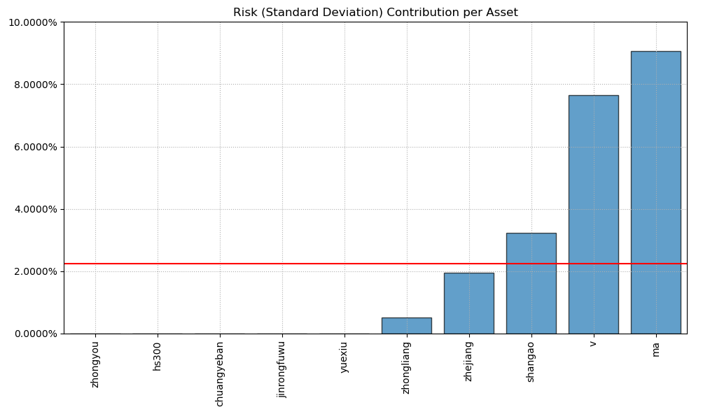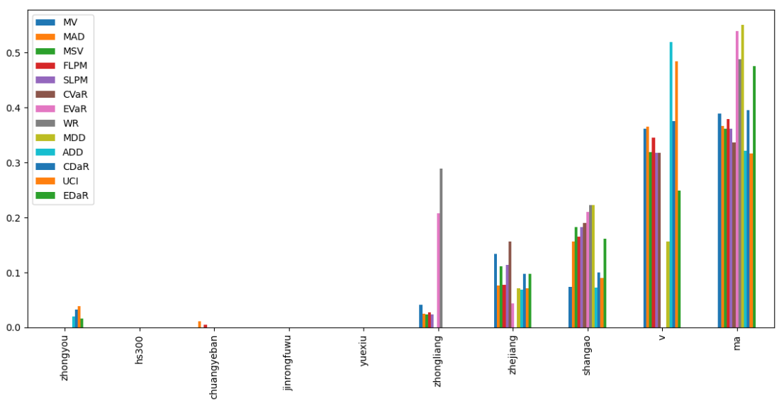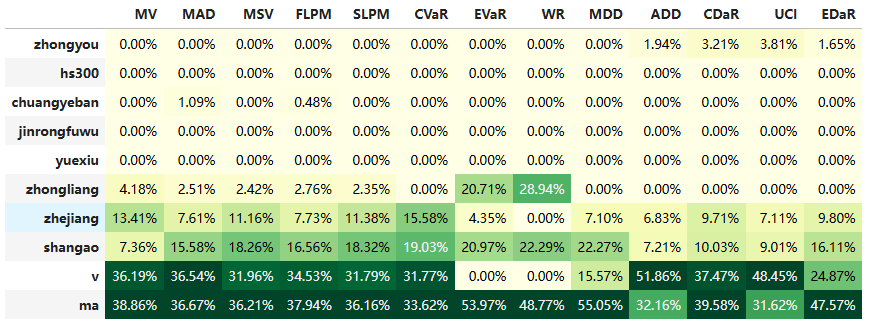 最后看下整个投资组合的情况,日度均值回报在0.11%,比上次测的经销商行业高50%,不过相应地8.88%的CVaR波动会大不少。(注:均值回报看Mean那一栏,越高越好;CVaR波动看CVaR那一栏,越低越好)