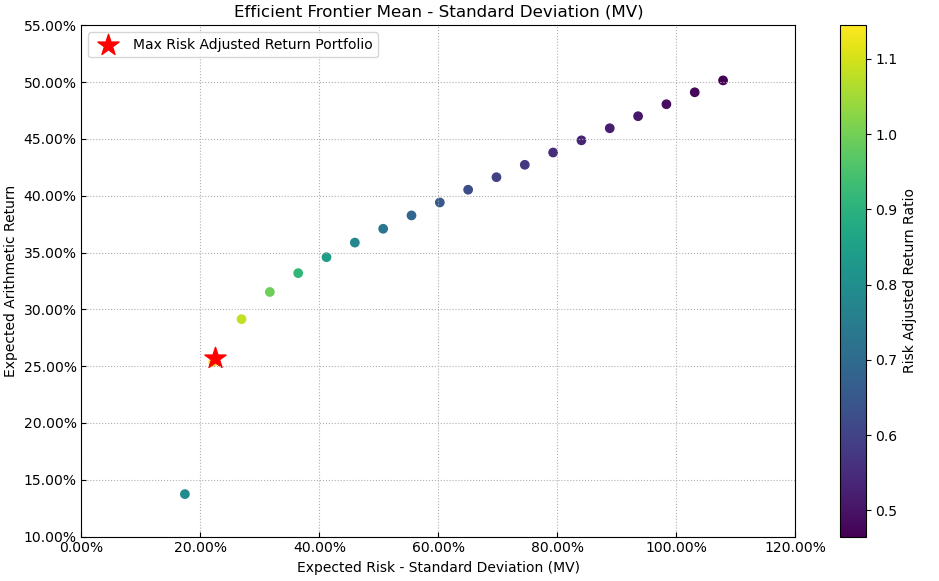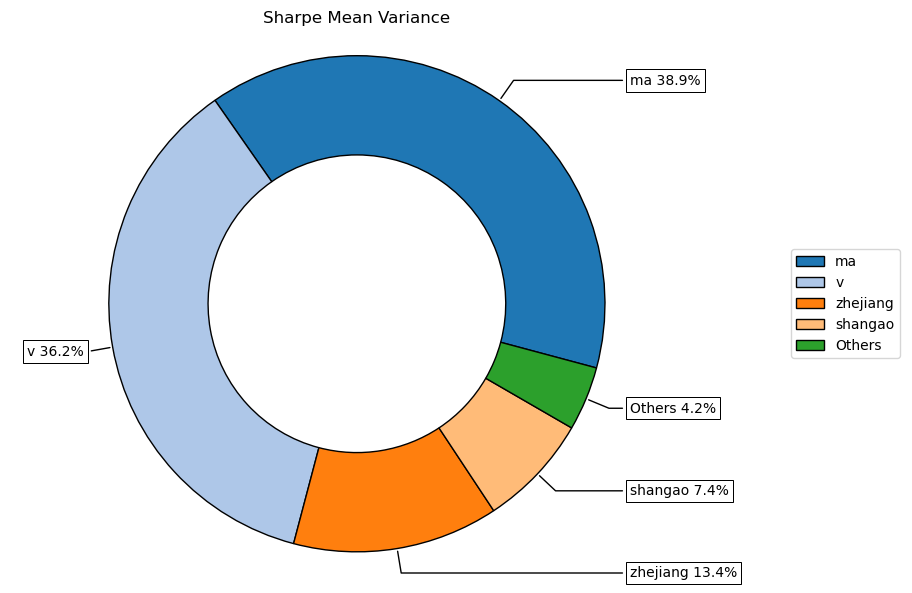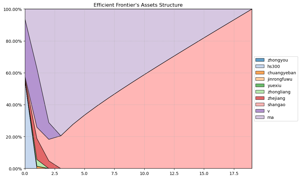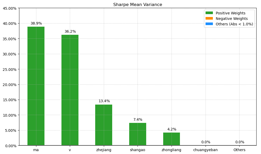 按最高夏普比率配置的话,系统给的权重为0,最大权重给了美股的万事达卡占比38.9%。(注:占比越高越好)