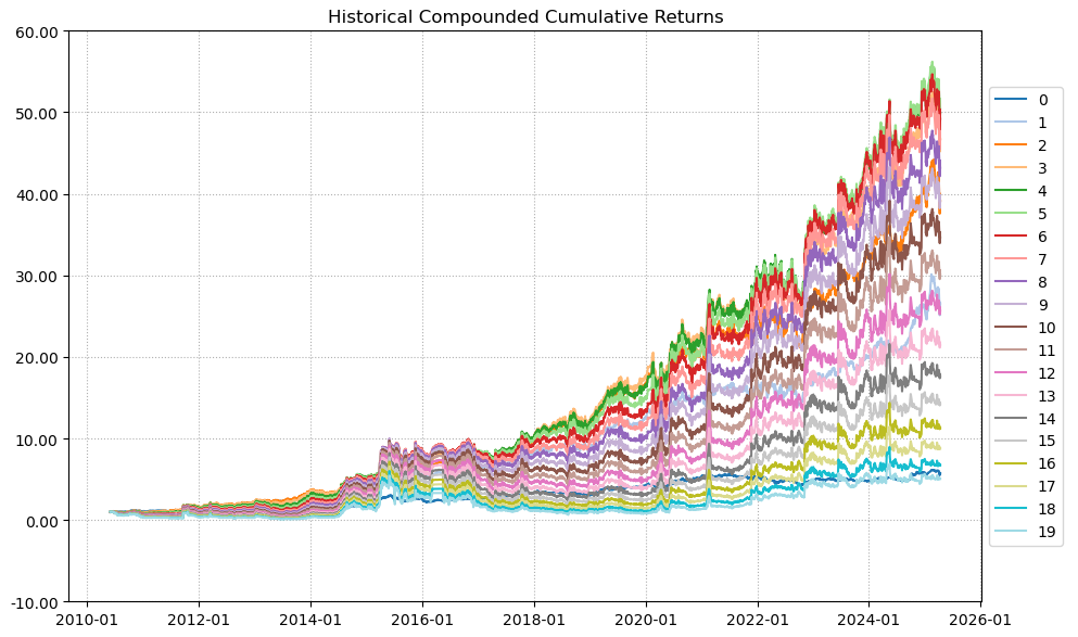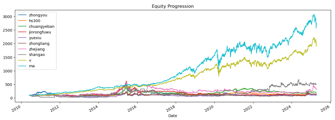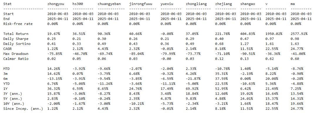 区间累计回报近40倍,最大回撤29.7%,投资组合的整体表现要好于中油资本个股。整个金融服务行业盈利能力优秀,波动中高,夏普比率1.14很亮眼。(注:累计回报看Cumulative Returns那一栏,越高越好;最大回撤看Maximum Drawdown那一栏,越低越好)