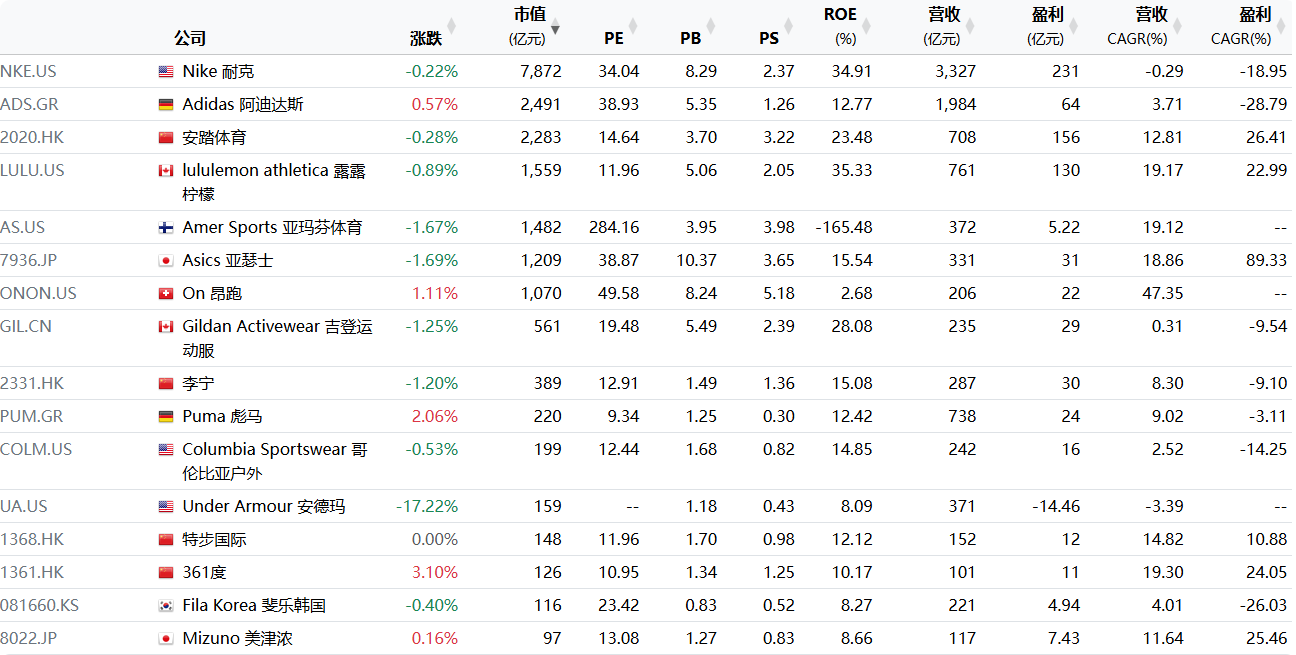 看上去puma和李宁有点低估,安踏旗下的Amer有点高估,