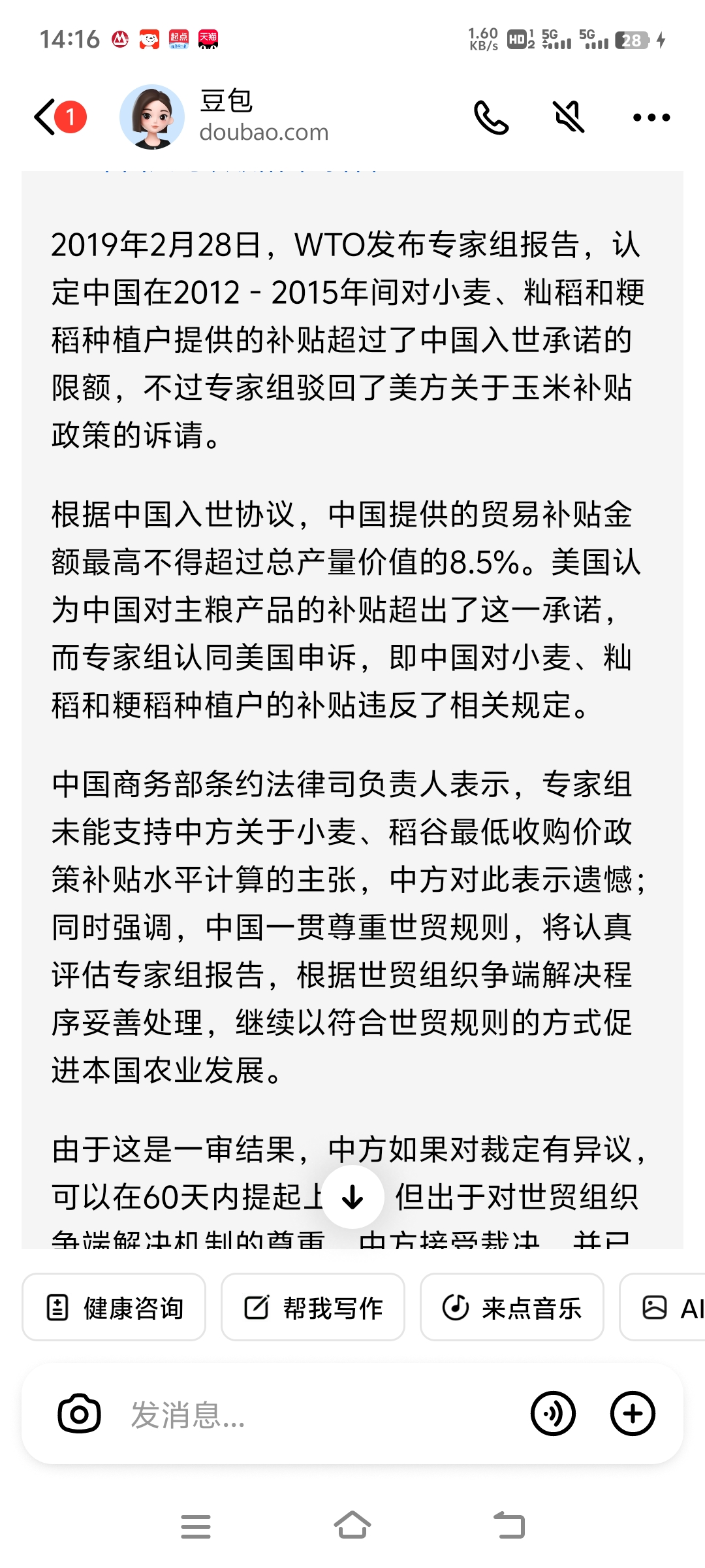 根据提供的信息,查找到了官媒的信息。理由是超额补贴......然后就出现了你所说的“前几年迫于美国的压力,政府承诺减少对农民及农业的补贴”的说法,看到这个说法,作为农村人,看着越来越多放荒的地,只想说能要点脸吗?这么多年补贴了多少钱,补贴水平怎么样,有多少补贴是到了真正种地的农民手里的,有多少农民知道有这个补贴,真当我们没数啊。你了解补贴的计算方法么?补贴不是按人头算的,是按亩数或者接斤数算的。