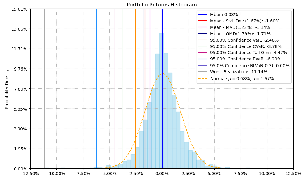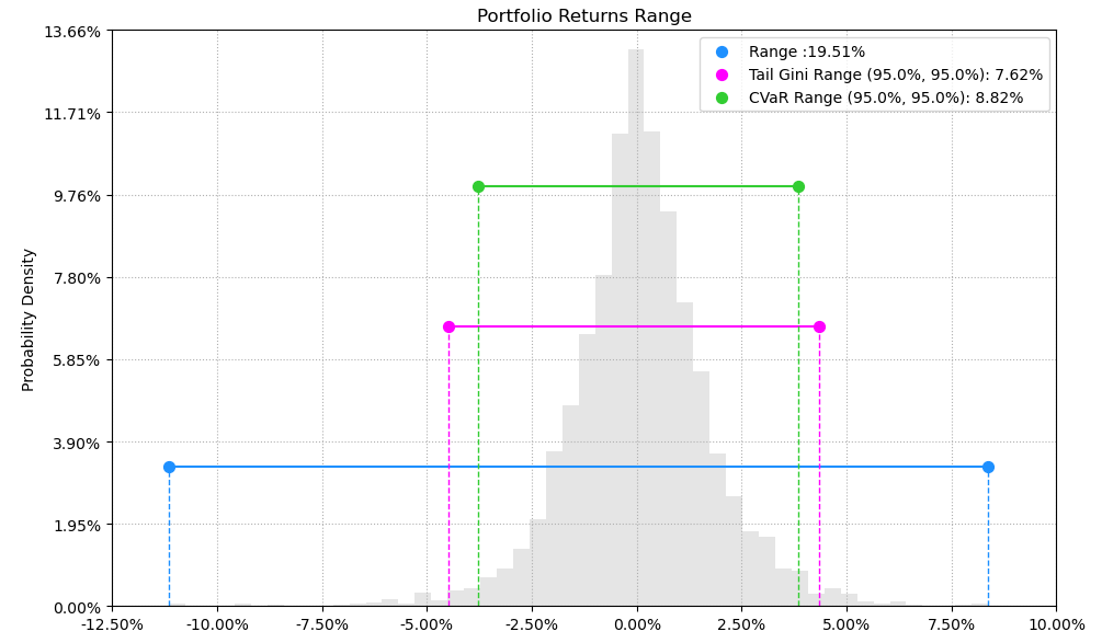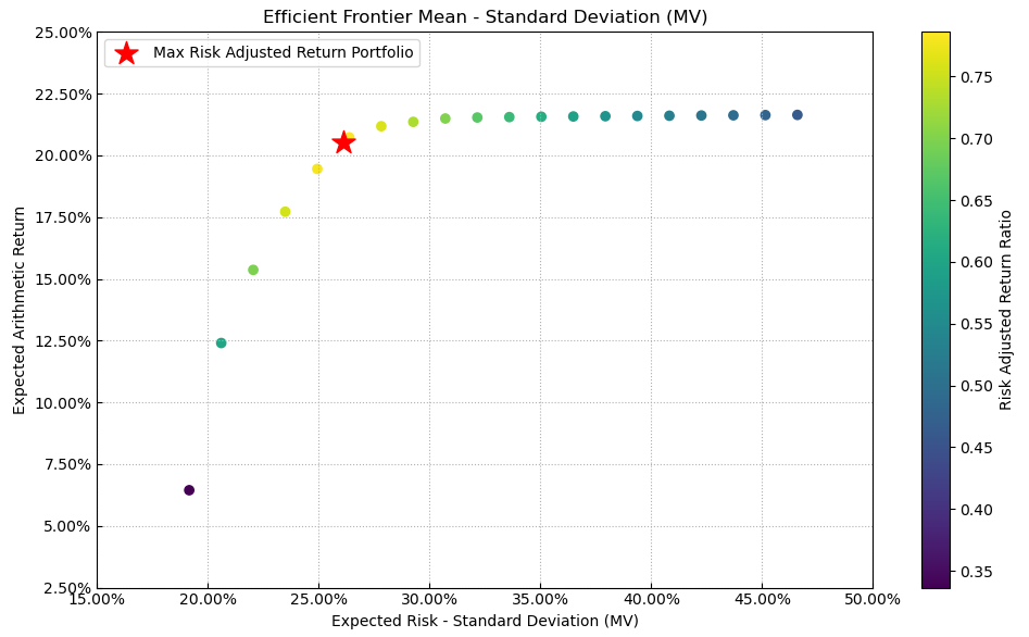 最后看下整个投资组合的情况,日度均值回报在0.08%,跟上次测的黄金行业差不多,不过8.82%的CVaR波动会略小一些。(注:均值回报看Mean那一栏,越高越好;CVaR波动看CVaR那一栏,越低越好)