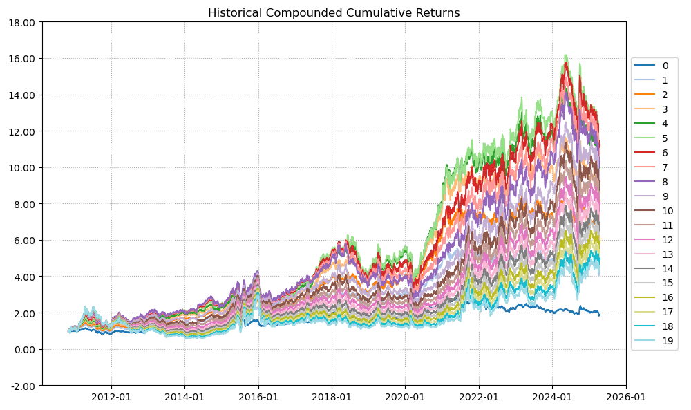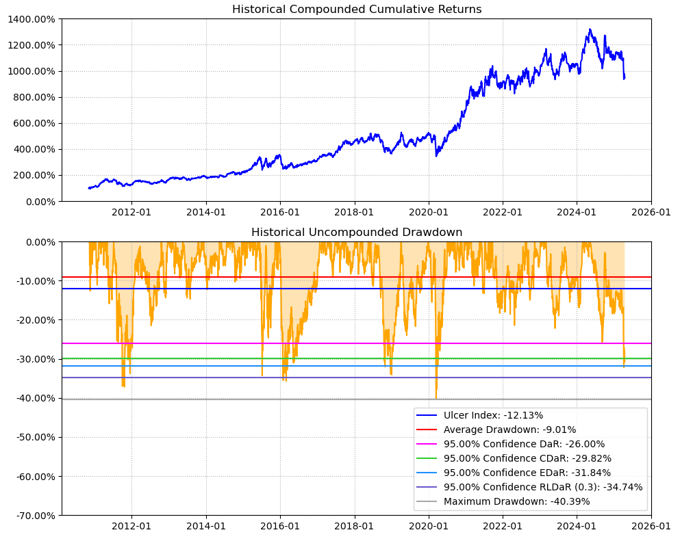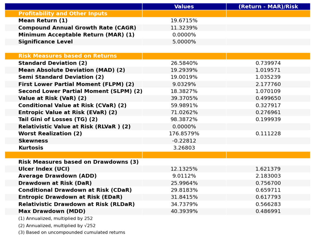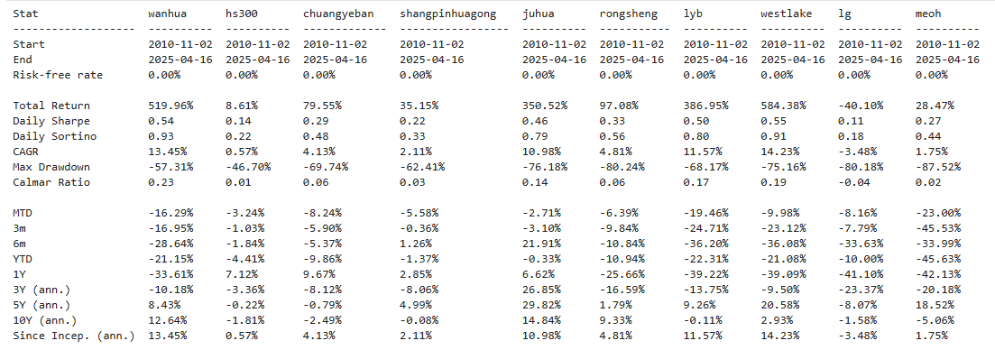 区间累计回报近14倍,最大回撤40.39%,投资组合的整体表现要好于万华化学个股。整个商品化工行业盈利能力还行,波动不小,夏普比率0.74有点拉胯。(注:累计回报看Cumulative Returns那一栏,越高越好;最大回撤看Maximum Drawdown那一栏,越低越好)