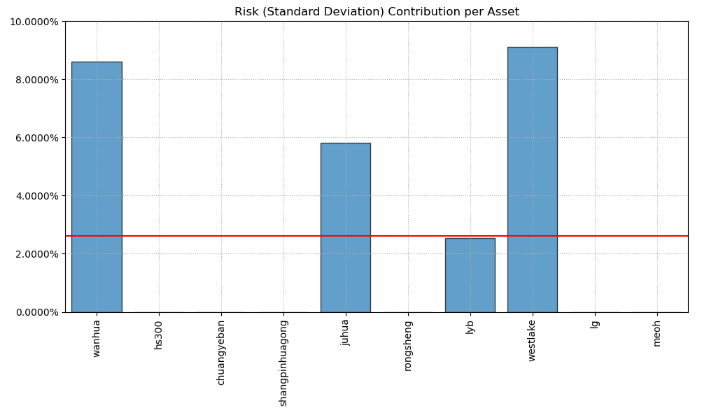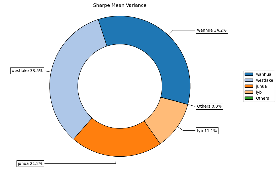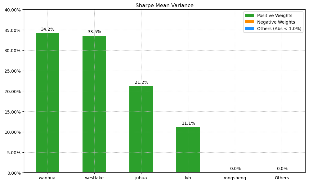 按最高夏普比率配置的话,系统给的权重为34.2%,第二权重给了美股的WESTLAKE占比33.5%。(注:占比越高越好)