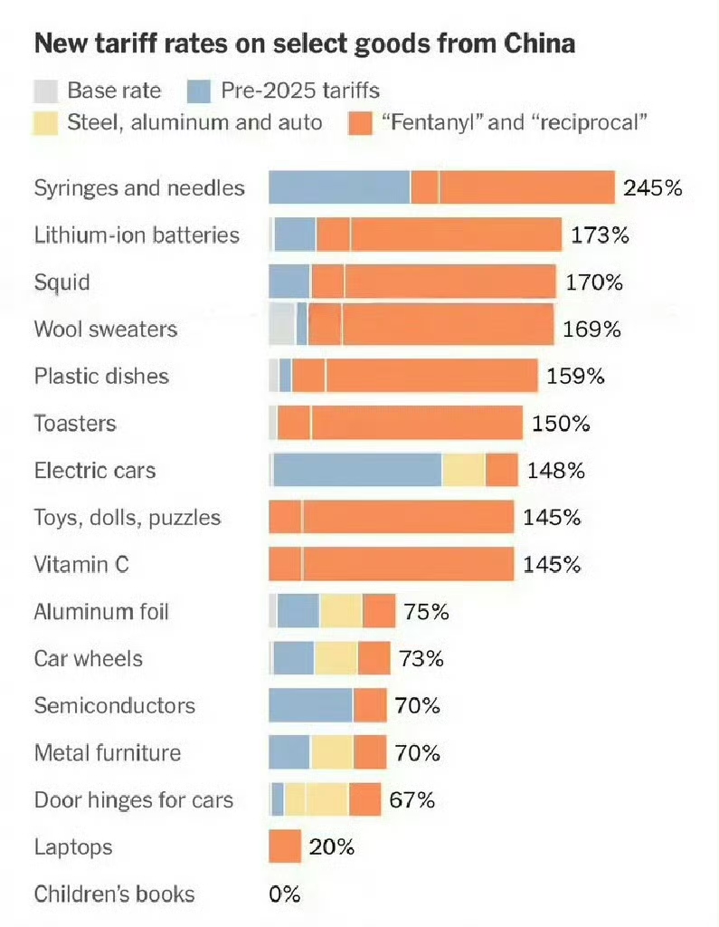 是145%叠加之前某些品类的加征才达到245%,不是全部,不是再加码。是的,没有新的加码。这个245%是4月推出的125%+3月芬太尼20%+拜登时期的301升级到100%(24年6月推出的)。这些100%的拜登征收的主要是医疗耗材,电池,新能源汽车等。医疗口罩和手套从26年开始也是100%的301关税,即累积245%。