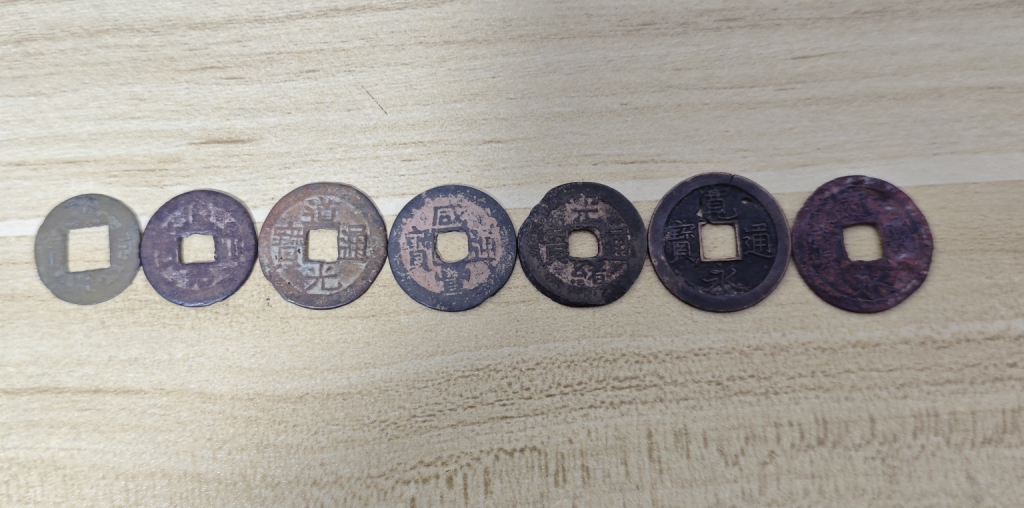 我也有钱币10来个,也是小时候地里找到的,都是清朝的铜钱