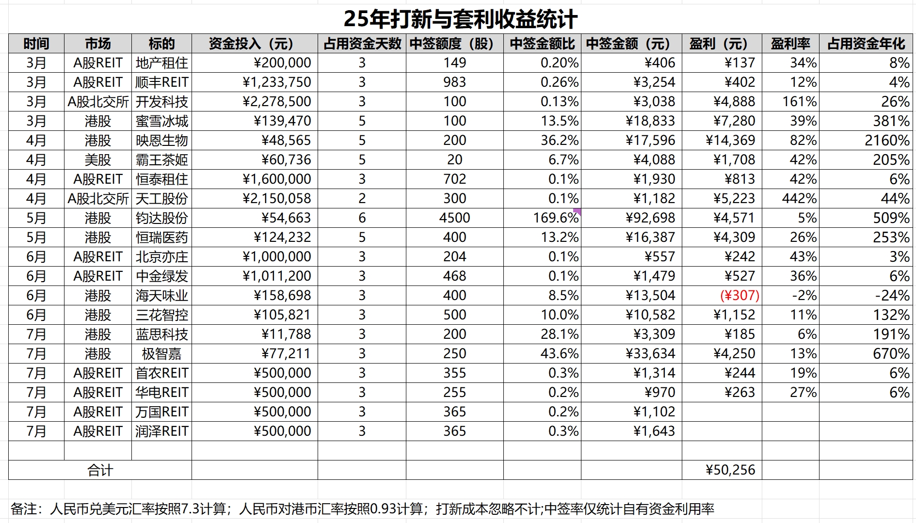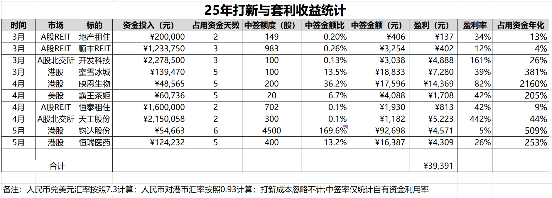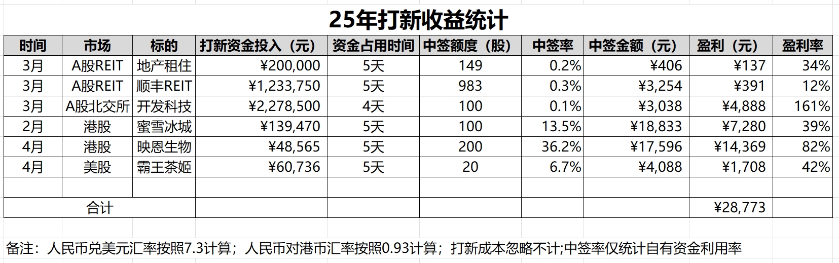 25年开始全面参与各市场的打新,包括A股、港股、美股,统计了下截至目前的收益率,如下: