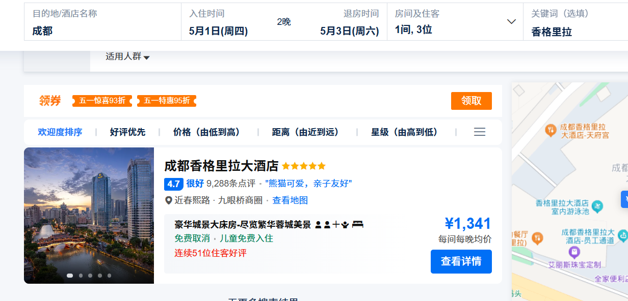 连锁酒店的大数据杀熟,老套路了。这种时候,宁可选择同价位的国际酒店品牌,还更靠谱点。成都三环内都不大,打车用不了几十,网约车还更便宜,没必要住在窗户就能看见网红熊猫的地方。成都真正的美食,反而是藏在居民区周边的小店。