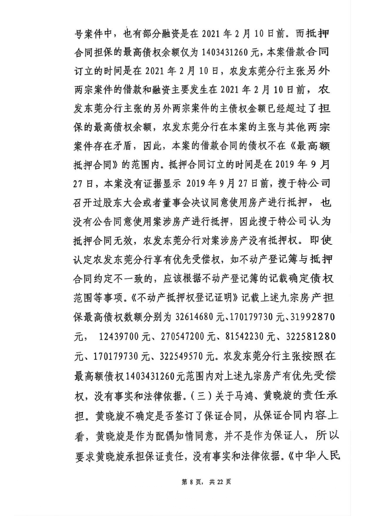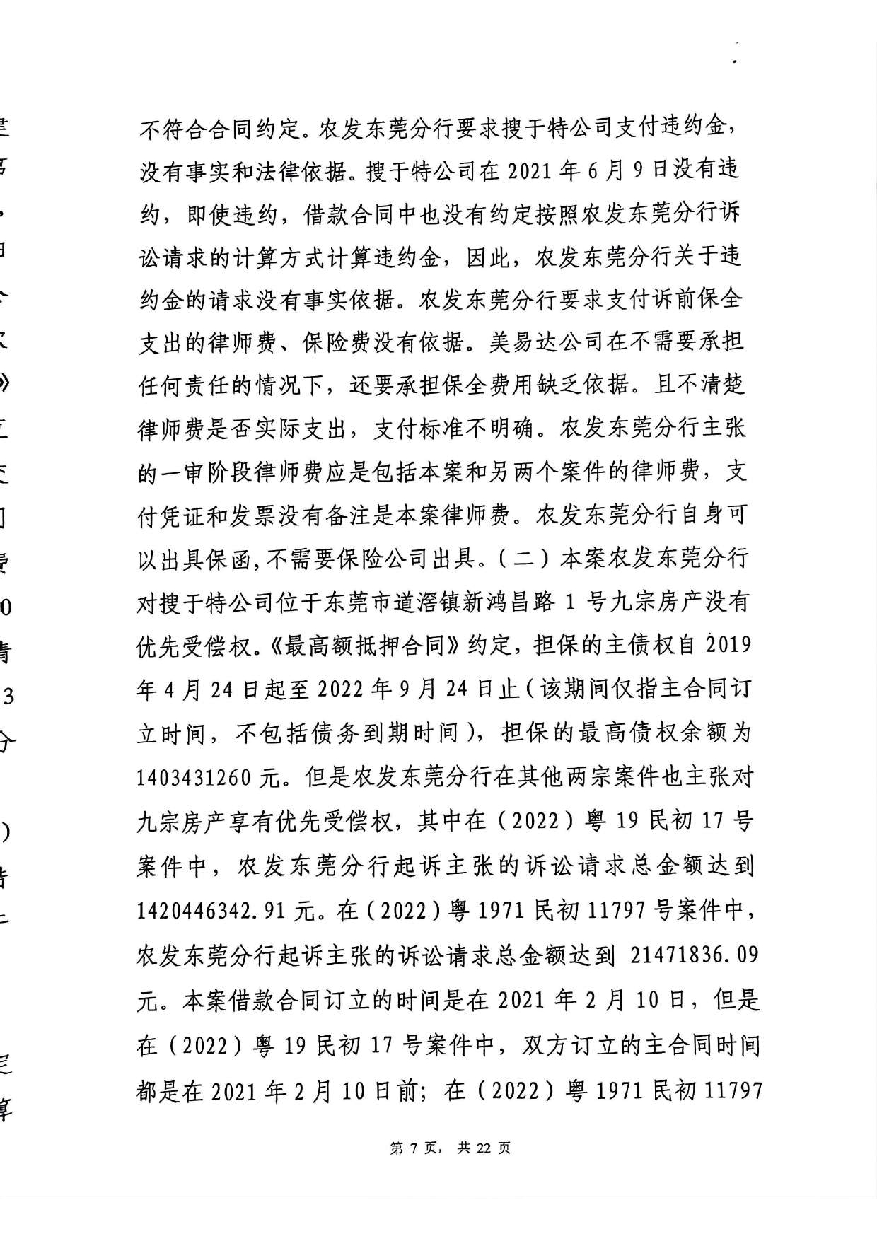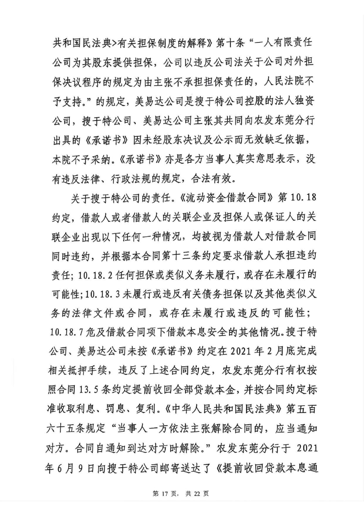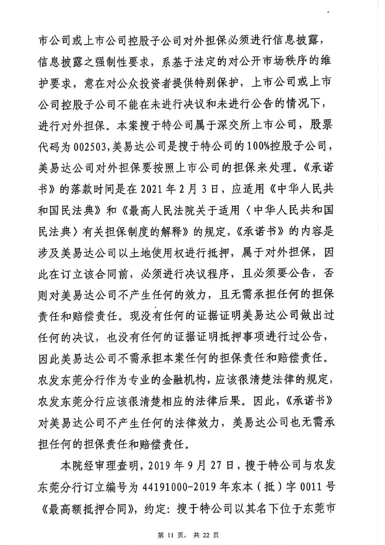 此判决后 搜特转债募投项目所在子公司美易达不服上诉至广东省高院,省高院依然判决 要搜特转债募投项目所在子公司美易达在该土地价值范围内承担赔偿责任!吴砝吴添! 至今 以上2个该判决仍然未见在裁判文书网公开!