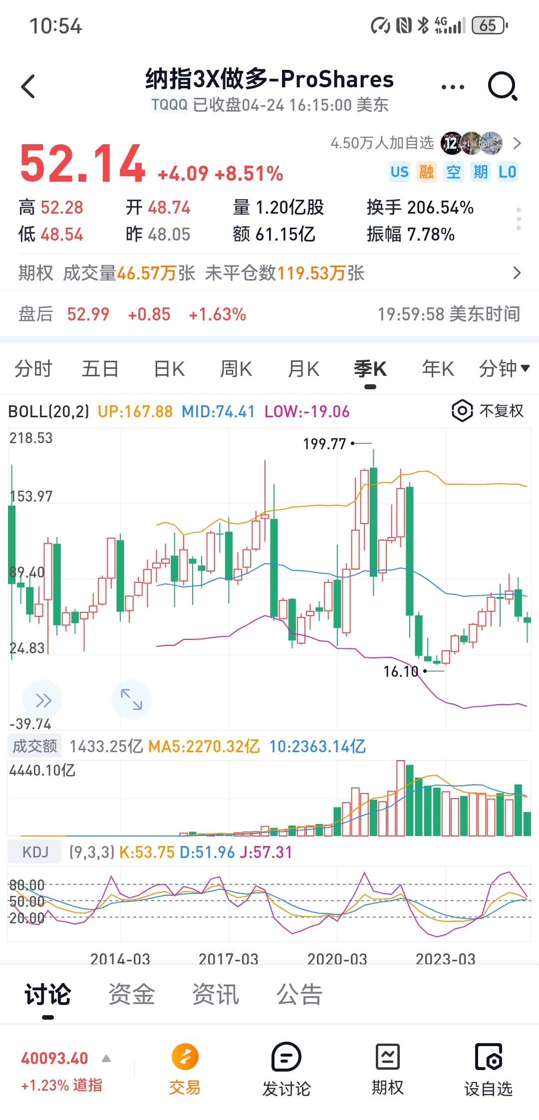 美股的三倍做多纳指,tqqq。很多大v都在推,用来对冲之类的。但我就信一条。纳指这么大牛市。他是三倍杠杆,市值竟然只有30亿。看曲线,也没看出来纳指的三倍牛市,咱也不懂,咋也不问。但咱知道,不懂不做。