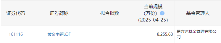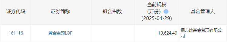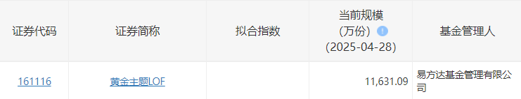 2025年4月28日,黄金主题LOF场内规模11,631.09万份,新增3,375.46万份,相当于7万辆拖拉机申购。
