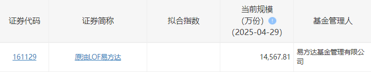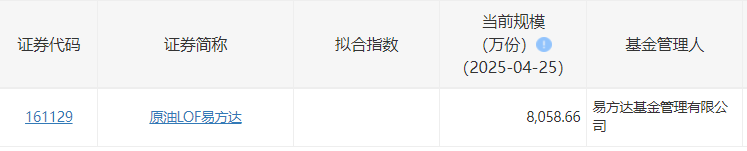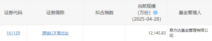 2025年4月28日,原油LOF易方达场内规模12,145.83万份,新增4,087.17万份,相当于8万辆拖拉机申购。