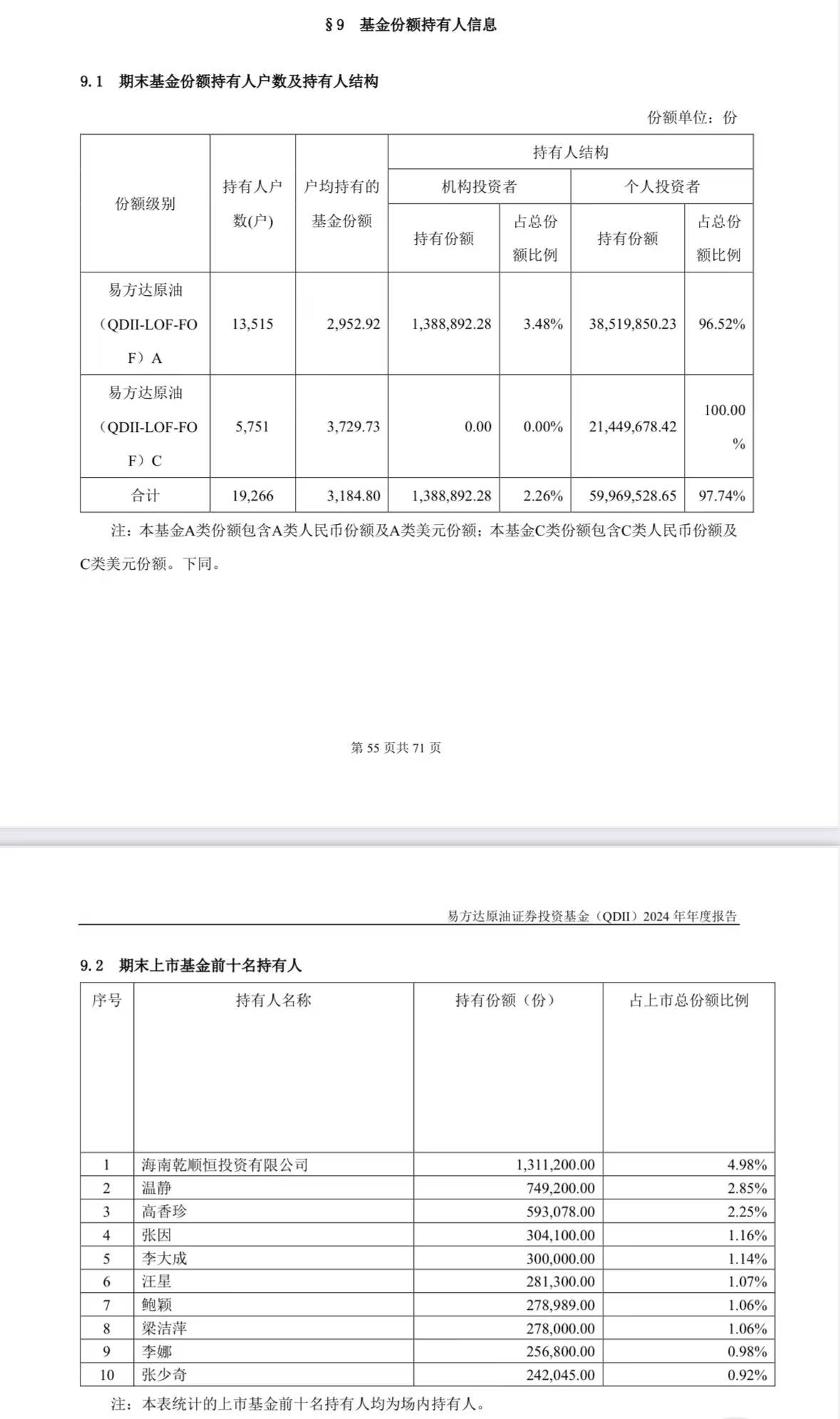 2024年末,原油LOF易方达持有人19266户,户均持有3184份。