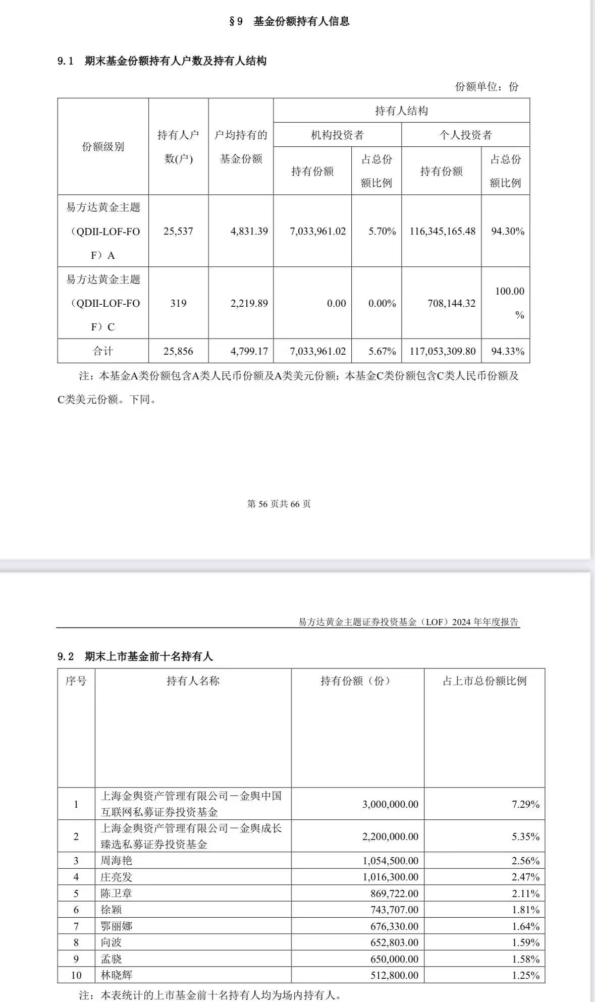 2024年末,黄金主题LOF持有人25856户,户均持有4799份。