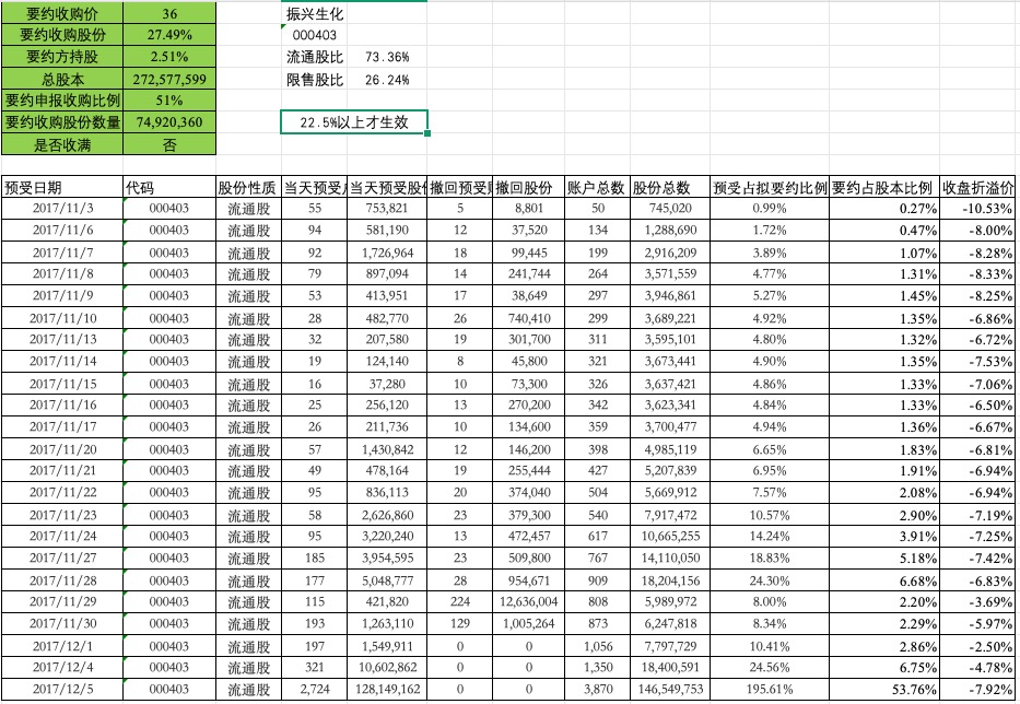 1、历史统计:从我经历过的部分要约收购看,我统计了近十年的,参与申报要约申报的股权比例最高的是2017年的振兴生化。振兴生化的要约是要约人在已持有2.51%股权的基础上再要约收购27.49%的股权,同时限售股比大概26%,该次部分要约最终折价7.92%,申报要约的总股比为53.76%。另外,需要着重指出的是,该次要约以申报不少于22.5%作为生效条件,在倒数第二天申报要约的股比为6.75%,最后一天直接跃升至53.76%。