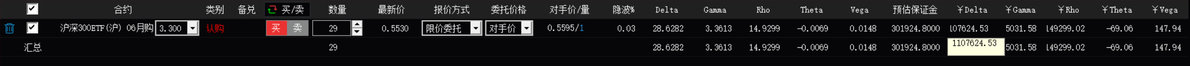 以沪深300为例,一张期货合约市值大概111万左右,那我买29张6月3.3的购,¥Delta也是111万左右,两者盈亏是不是相当或者接近的,29张期权一共16万,保证金股指期货是15.6万,灵活性上期权高不少,张数随意调整,股指期货单位比较大,流动性上期货好一些,实值期权交易不太活跃,还有其他要考虑的问题么