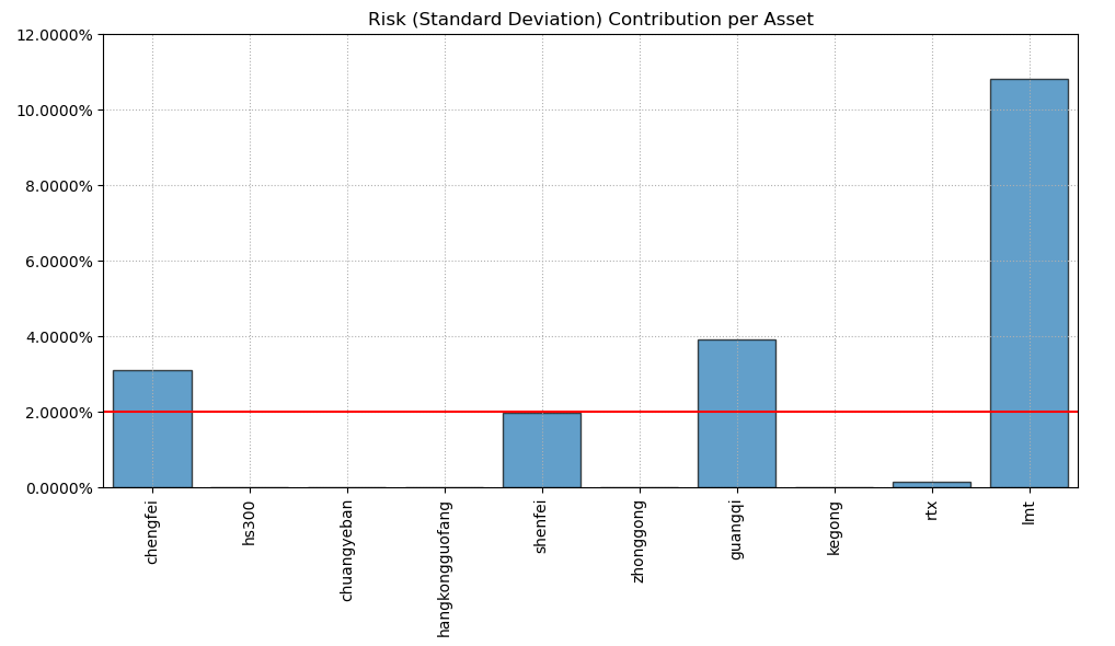 按最高夏普比率配置的话,系统给的权重为10.4%,最高权重给了美股的洛克希德马丁占比66.6%。(注:占比越高越好)