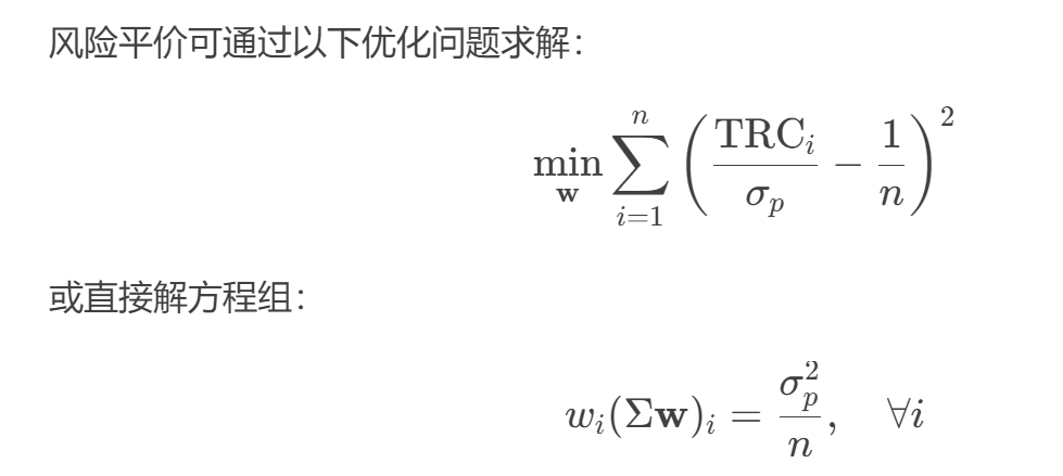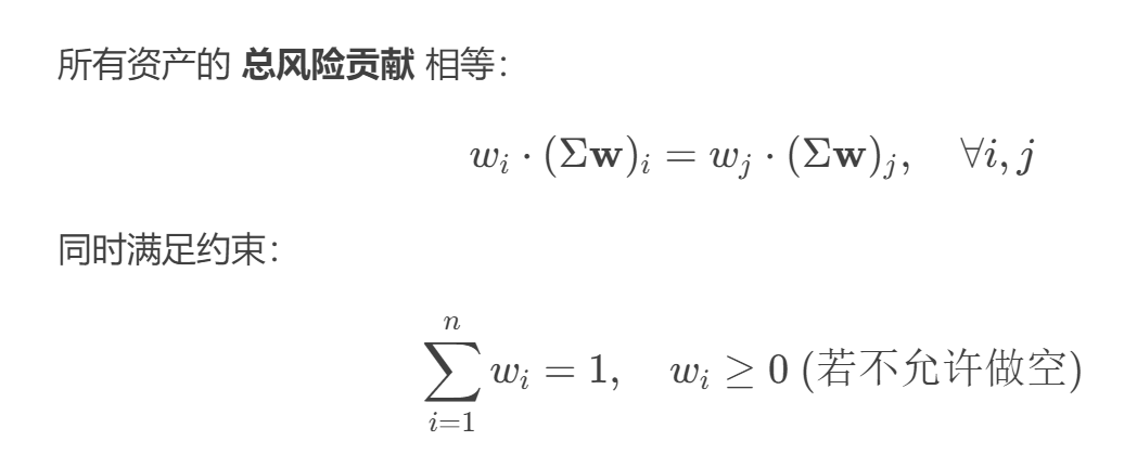风险平价模型是一整套非线性函数,其数学核心是确保每个资产的权重与其边际风险贡献的乘积相等,从而实现风险均衡分配。风险平价模型的核心数学条件与公式展示如下: