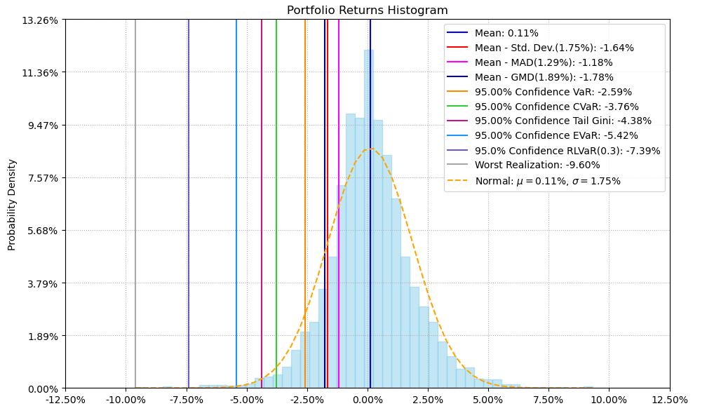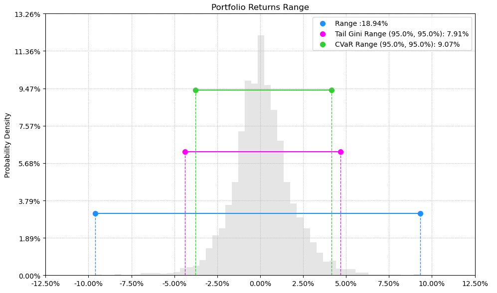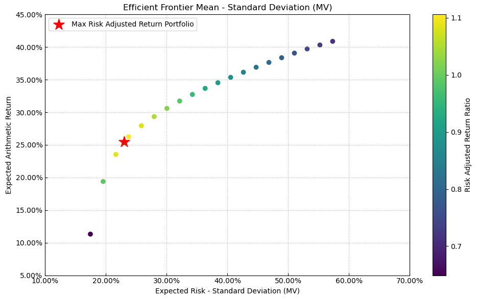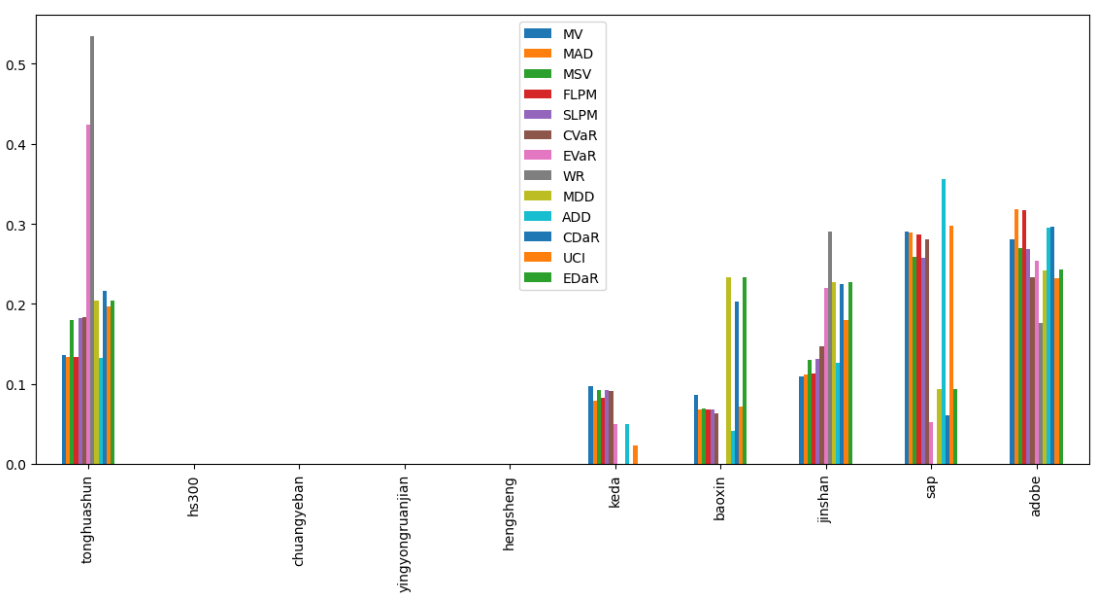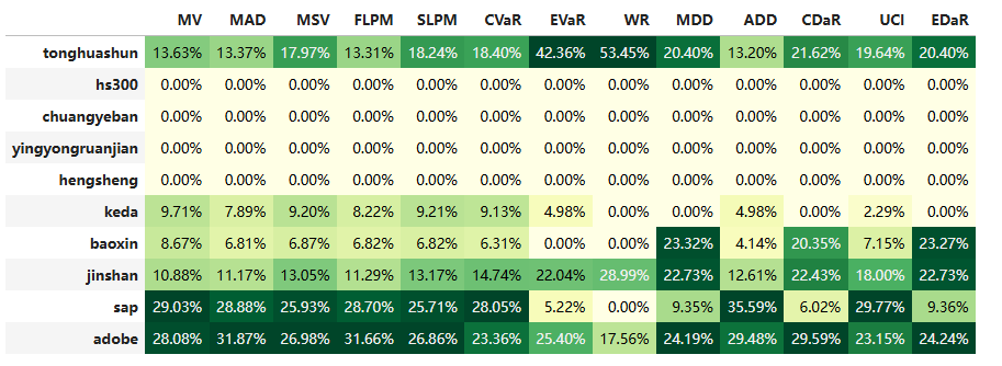 最后看下整个投资组合的情况,日度均值回报在0.11%,比上次测的光伏设备行业低30%,不过相应地9.07%的CVaR波动也会小一些。(注:均值回报看Mean那一栏,越高越好;CVaR波动看CVaR那一栏,越低越好)