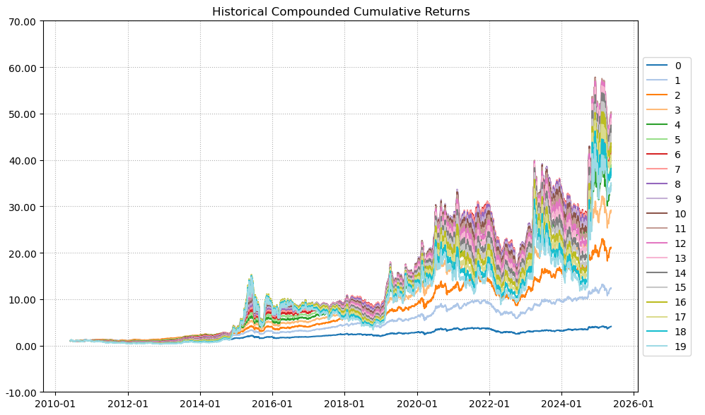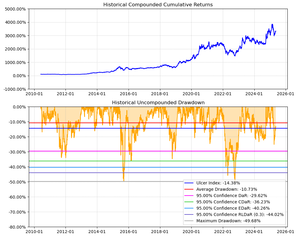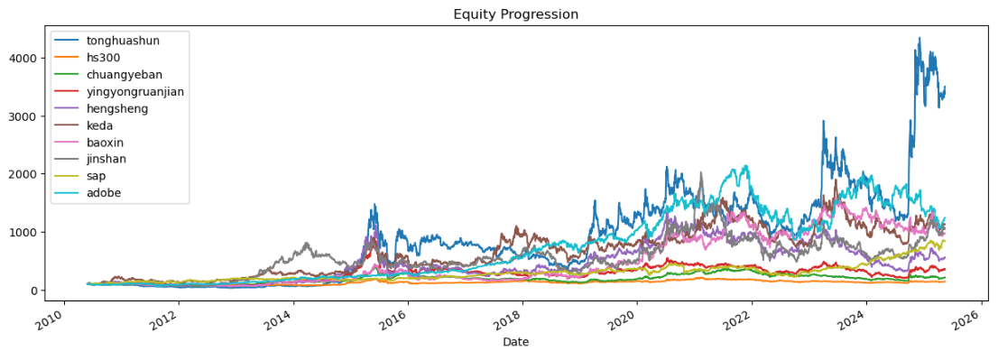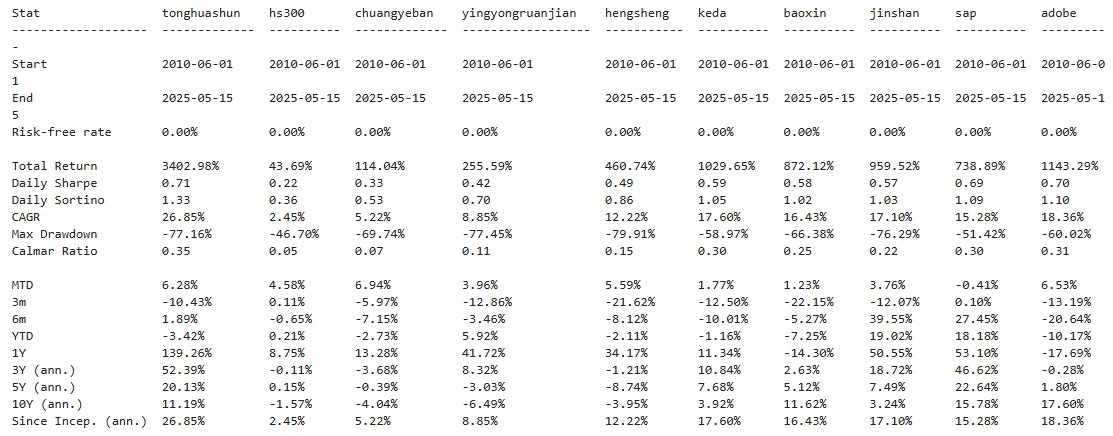 区间累计回报近40倍,最大回撤49.68%,投资组合的整体表现要好于同花顺个股。整个应用软件行业盈利能力惊艳世人,波动偏大,夏普比率1.11很有竞争力。(注:累计回报看Cumulative Returns那一栏,越高越好;最大回撤看Maximum Drawdown那一栏,越低越好)