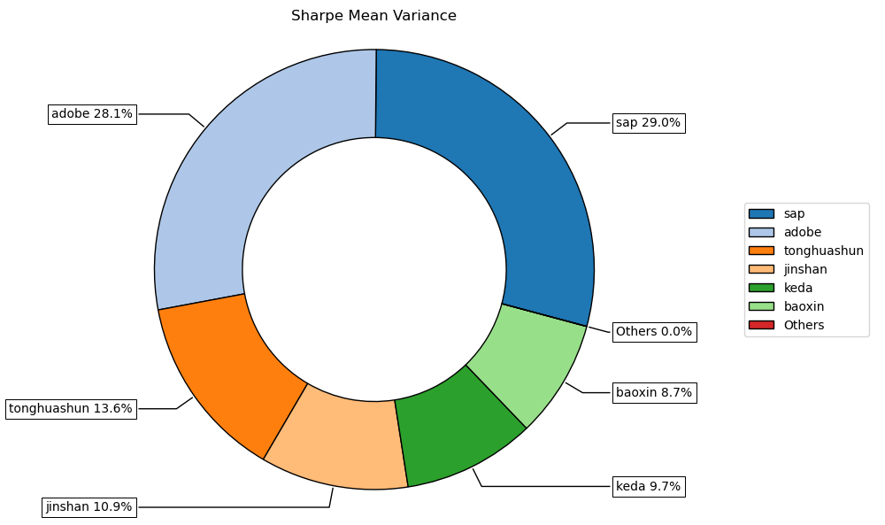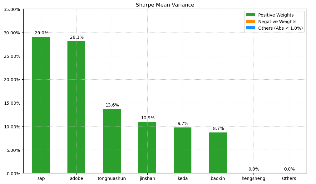 按最高夏普比率配置的话,系统给的权重为13.6%,最高权重给了美股的思爱普占比29.0%。(注:占比越高越好)