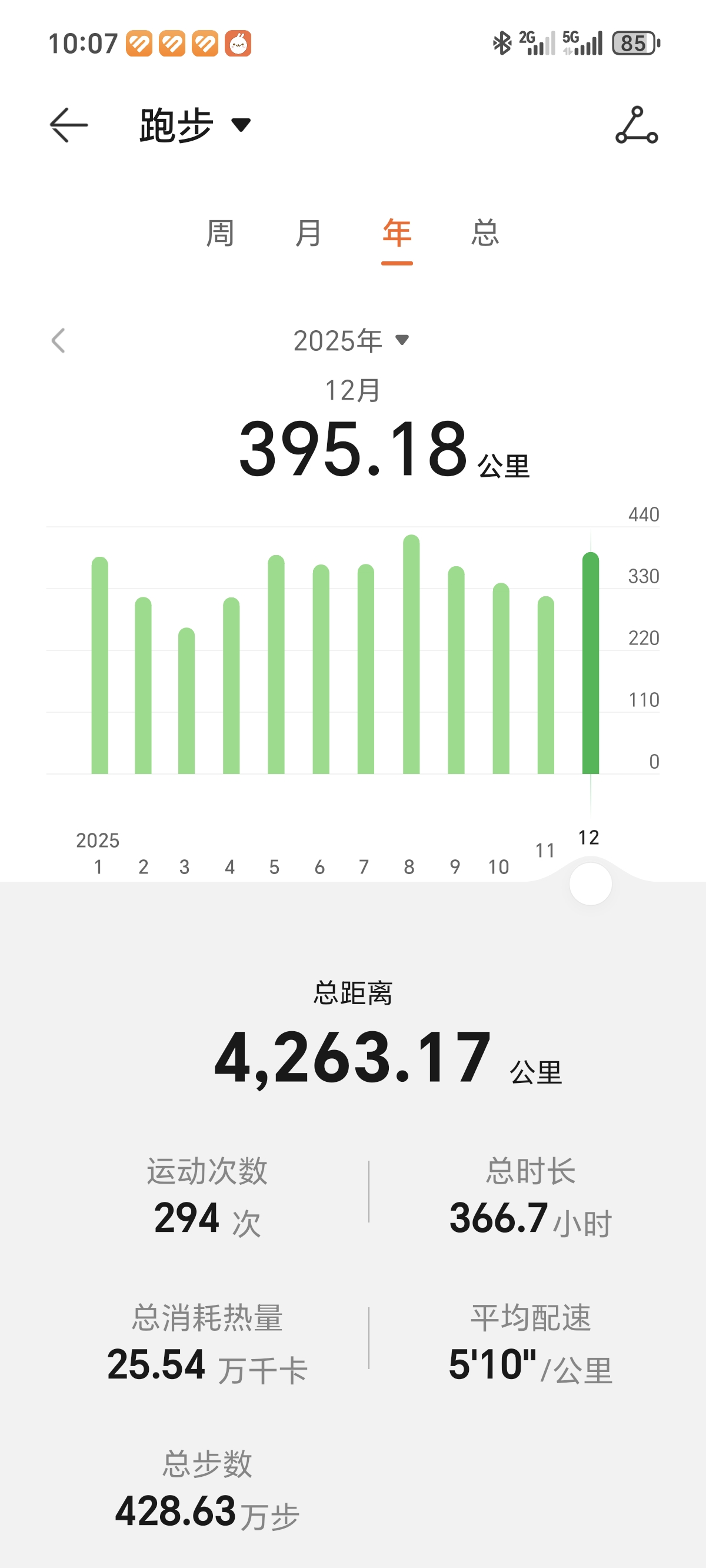 跑步5年了。从开始的800米,慢慢的到现在的10公里。还没有跑过半马,最多跑过18公里。不关注配速,也没参加比赛,只是作为健康的投资。目前隔天8公里10公里,或每天5公里。天气不好,不跑的时候跳绳,一般5000个。目前还没有受过伤。感觉跑步跑姿正确,不舒服就休息,应该不太会受伤。