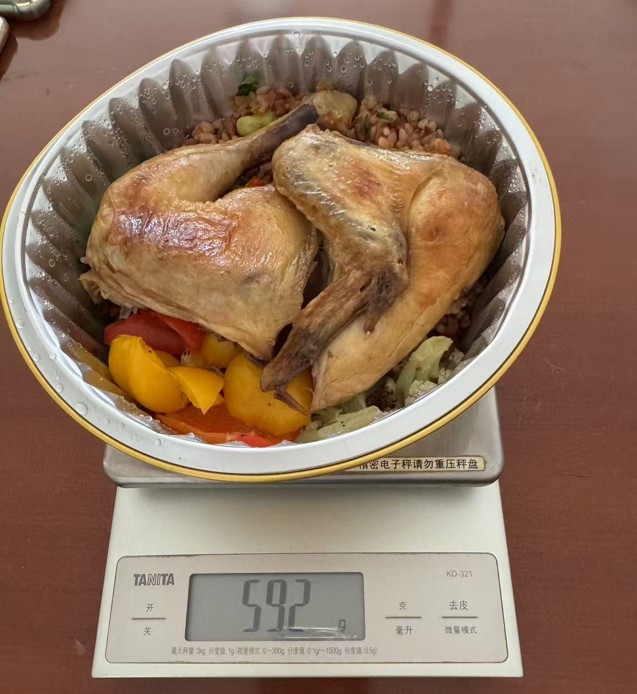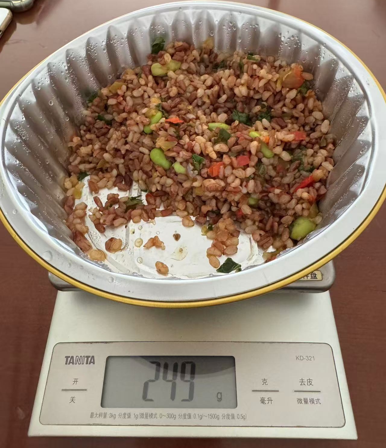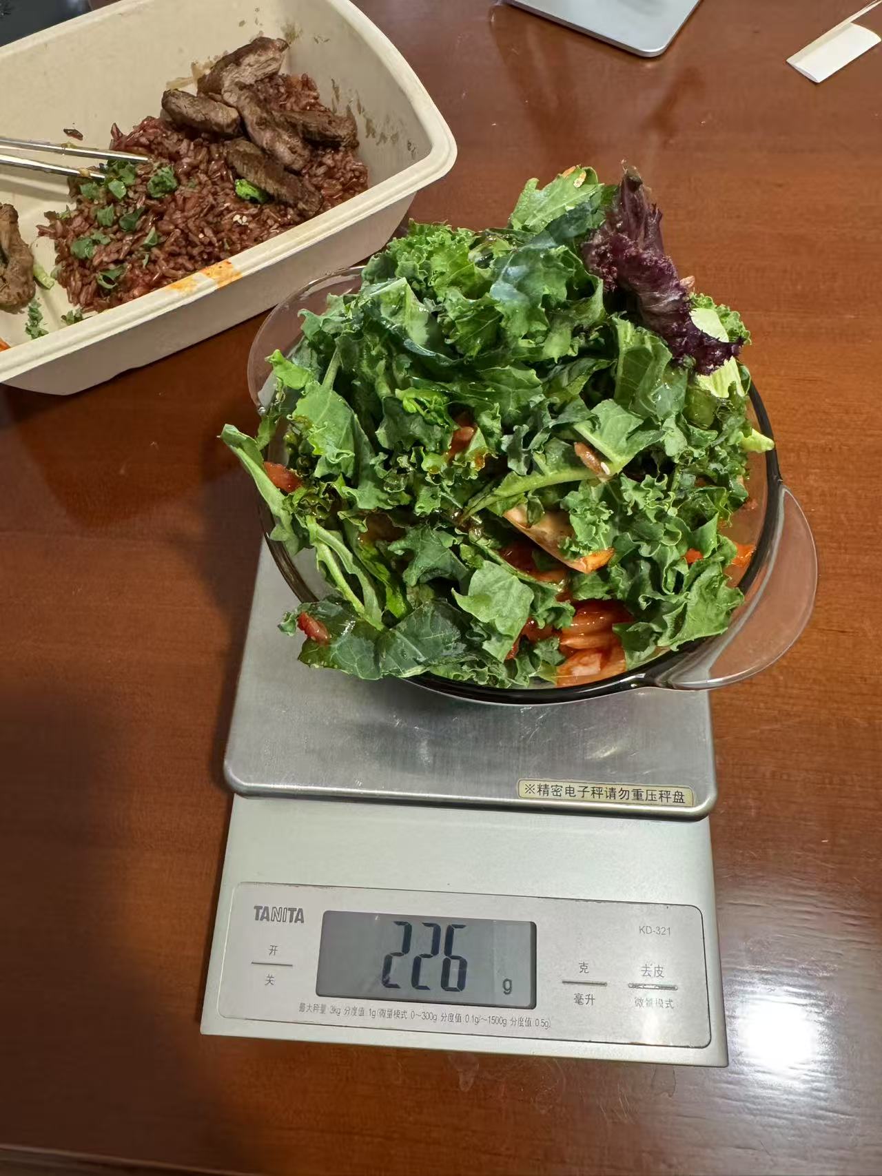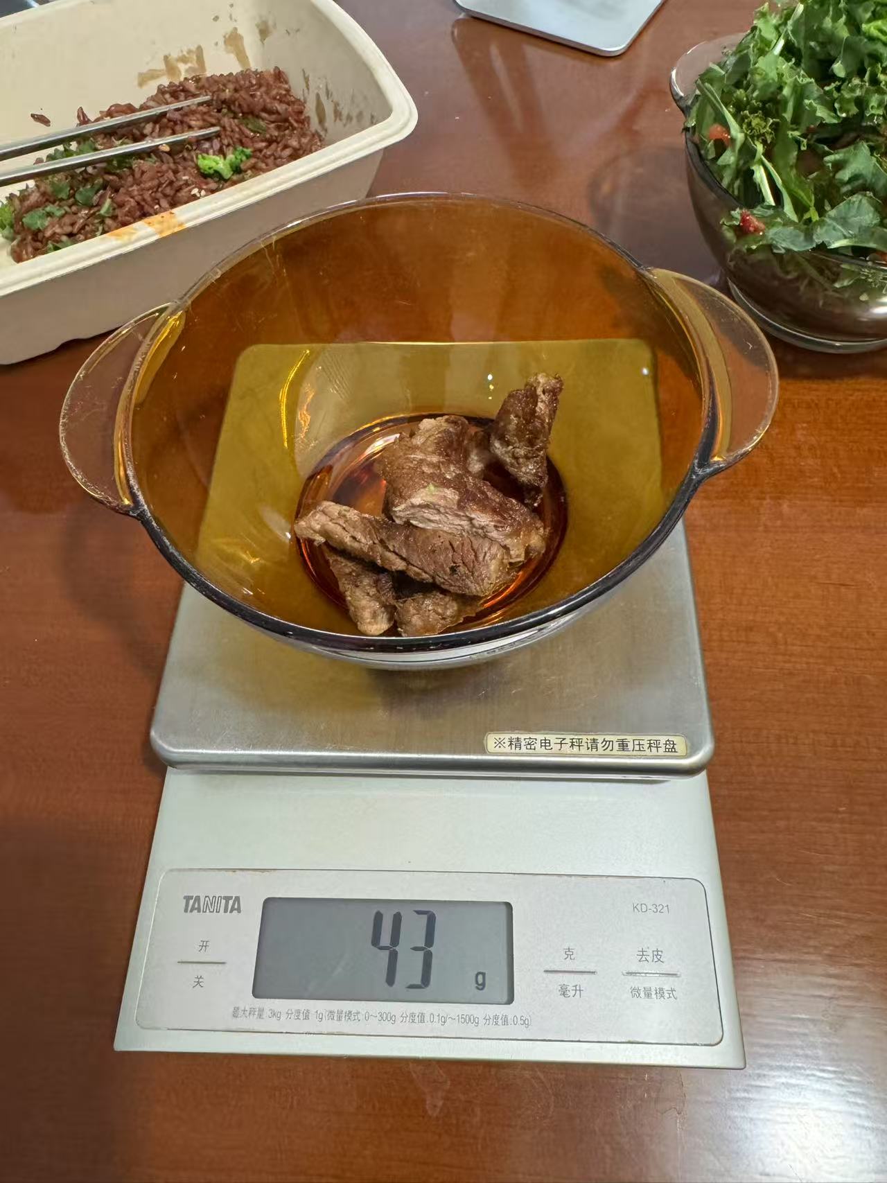 能量碗总体重量504克,去掉盒子39克,其中牛肉重量43g,米饭200克,蔬菜226克