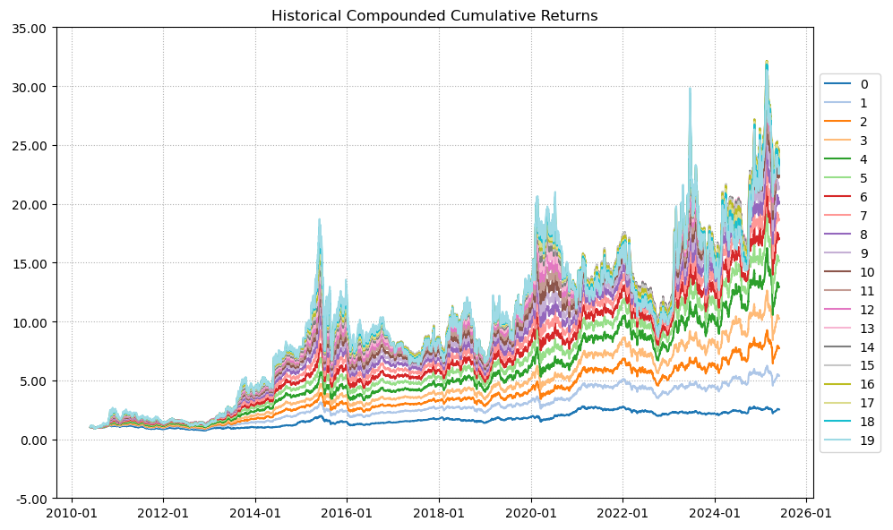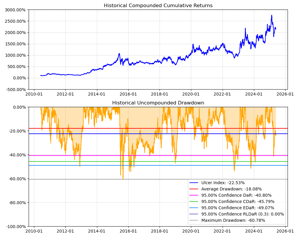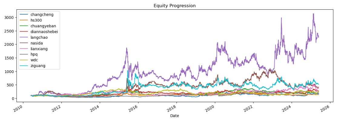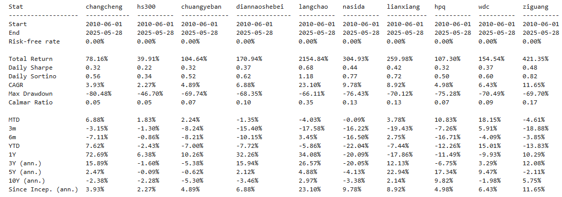 区间累计回报近30倍,最大回撤60.78%,投资组合的整体表现要好于中国长城个股。整个电脑设备行业盈利能力优秀,波动偏大,夏普比率0.83中规中矩。(注:累计回报看Cumulative Returns那一栏,越高越好;最大回撤看Maximum Drawdown那一栏,越低越好)