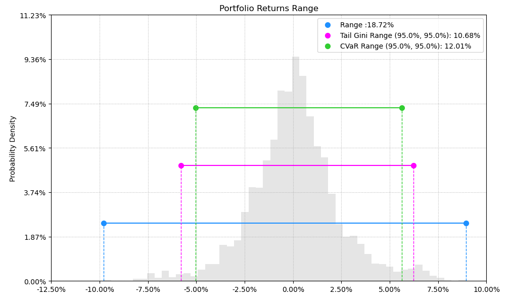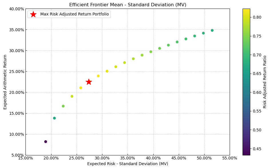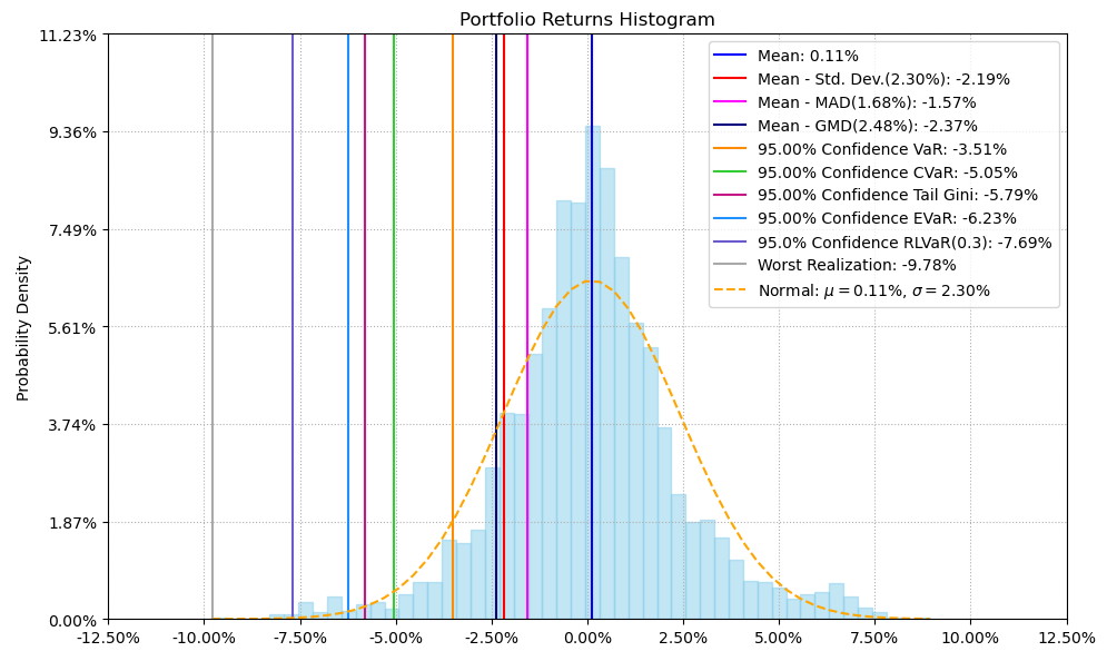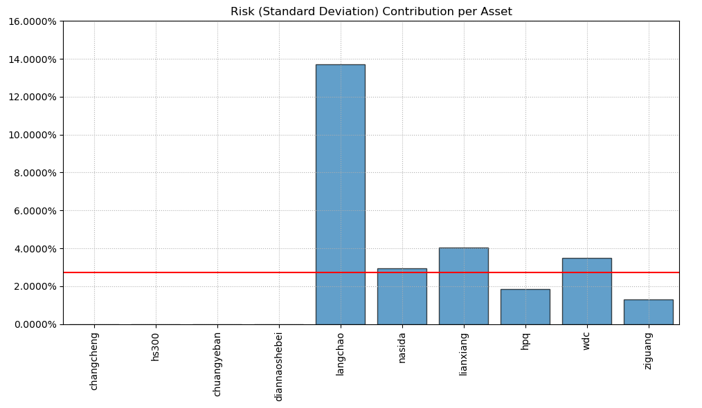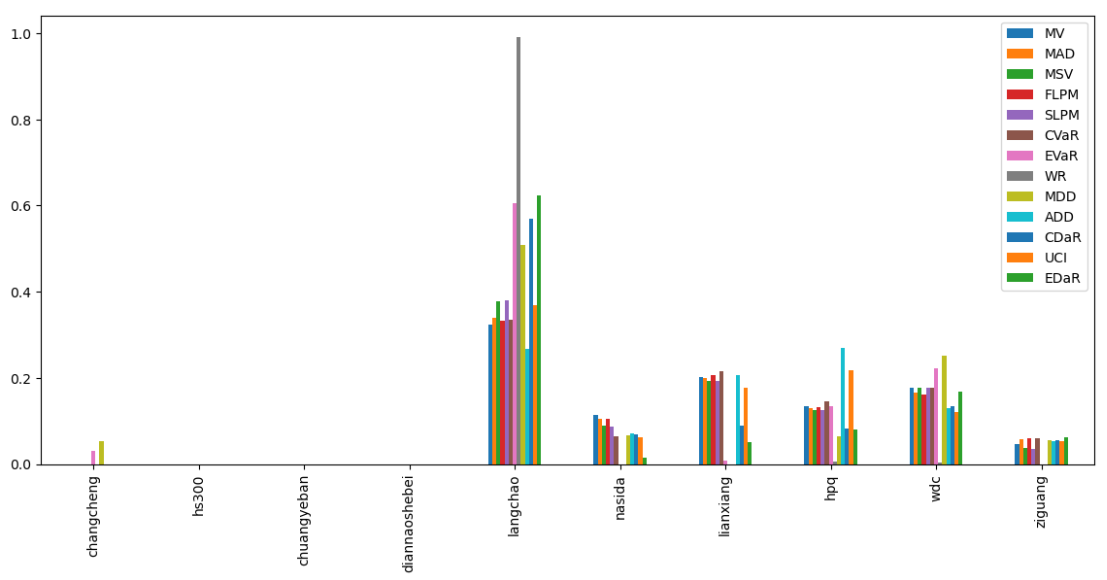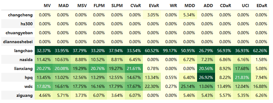 最后看下整个投资组合的情况,日度均值回报在0.11%,比上次测的重型设备行业高90%,相应地12.01%的CVaR波动也会大一些。(注:均值回报看Mean那一栏,越高越好;CVaR波动看CVaR那一栏,越低越好)