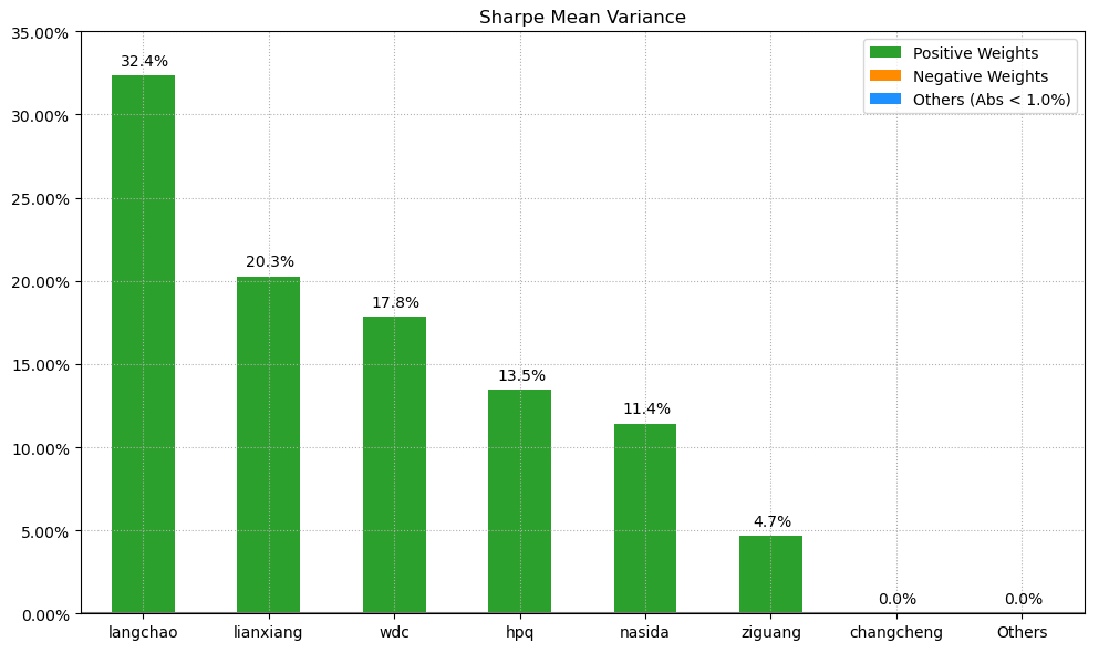 按最高夏普比率配置的话,系统给的权重为0,最高权重给了浪潮信息占比32.4%。(注:占比越高越好)