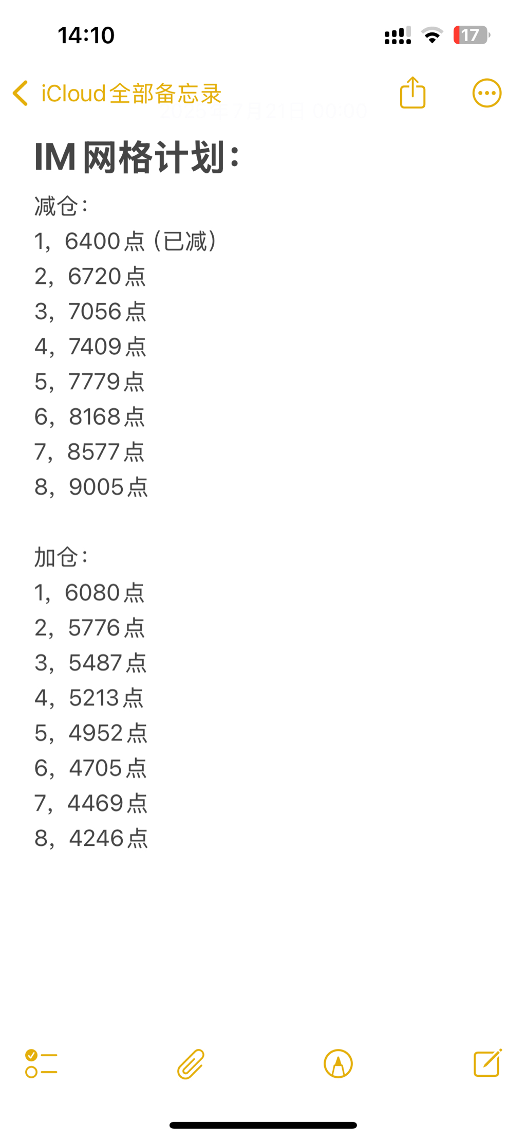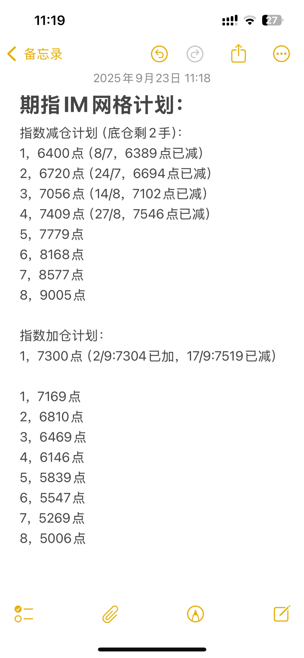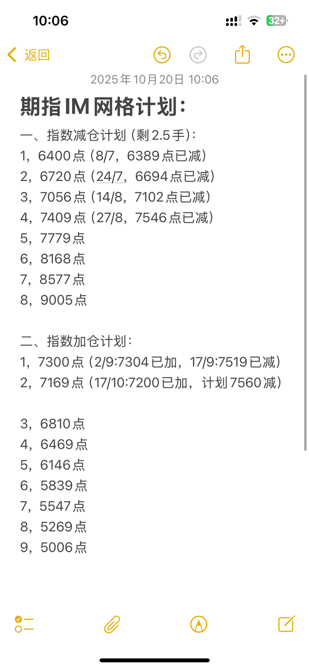最近股市涨势喜人,论坛公众号大V以及群友吃贴水策略基本上收益都新高了,这个时候,越是新高,我们越要冷静下来考虑接下来如果继续涨,我们应该如何减仓的问题。于是我简单的给自己定下来了网格减仓计划。正如3年前给自己定下来的盈利计划一样。3年前滚贴水给自己定下了5年期计划,分上中下三个目档盈利档位,上档是牛市来了赚1200万走人,中档是不来牛市赚750万走人,下档是来熊市赚500万走人。如今过去3年了,目标已实现一大半了,接下来如果真来牛市,是时候定下减仓退出计划了。希望最后2年能通过网格+贴水+增强最终实现5年的目标计划。