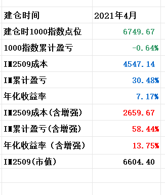 2021年4月截至今日,IM期指吃贴水增强策略,跑赢中证1000指数31.12%;吃贴水+保证金增强,跑赢中证1000指数59.08%。目前持仓IM2509,账户盈利继续新高。